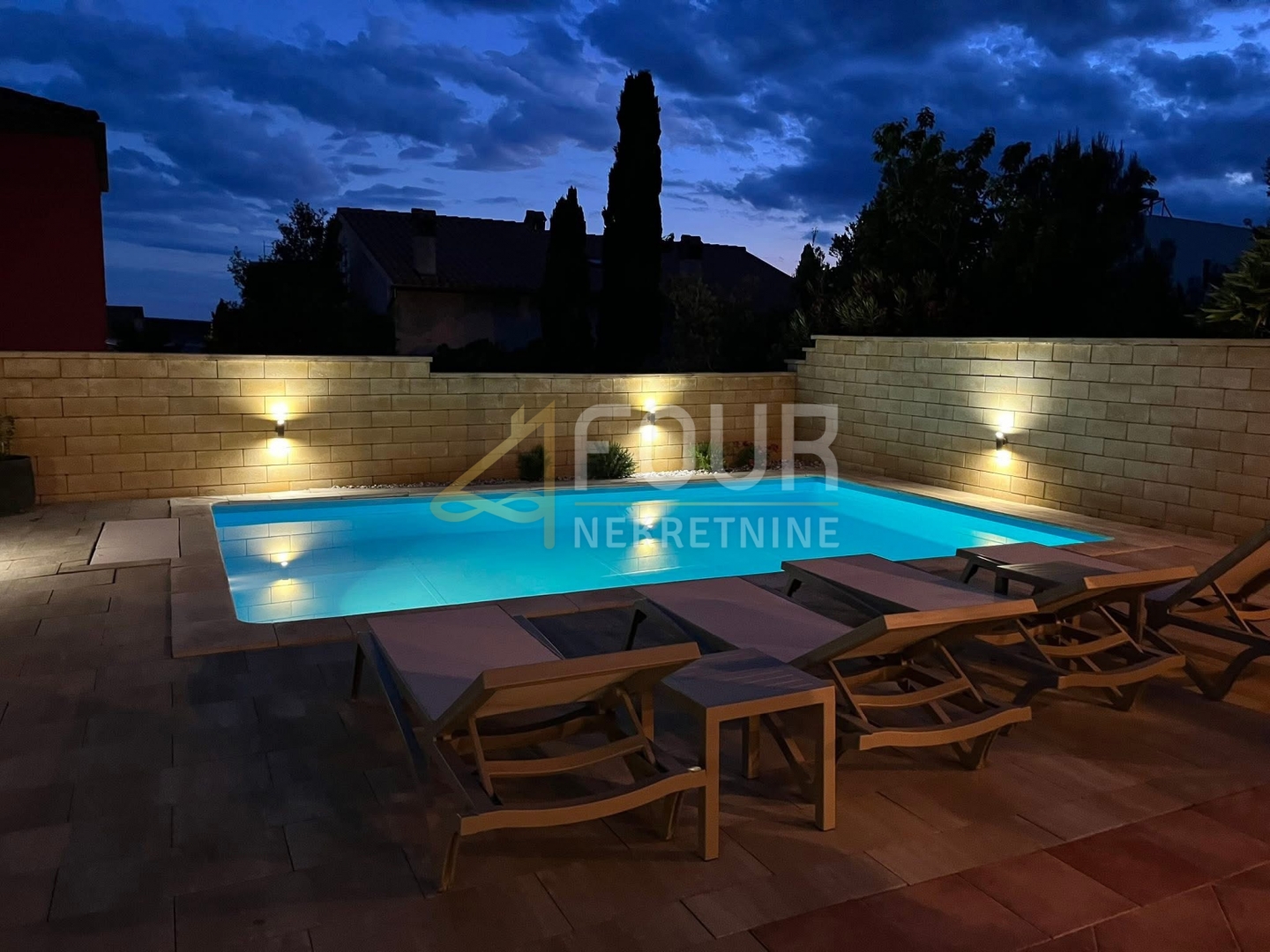 Okućnica površine oko 250 m2 uređena je i ograđena, popločana kvalitetnim Semmelrock pločama i obogaćena detaljima koji pružaju ugođaj mediteranskog doma. Bazen dimenzija 4 x 6,5 m s Desjoyeaux opremom, roštilj i sunčalište čine ovu nekretninu idealnim mjestom za odmor i uživanje.