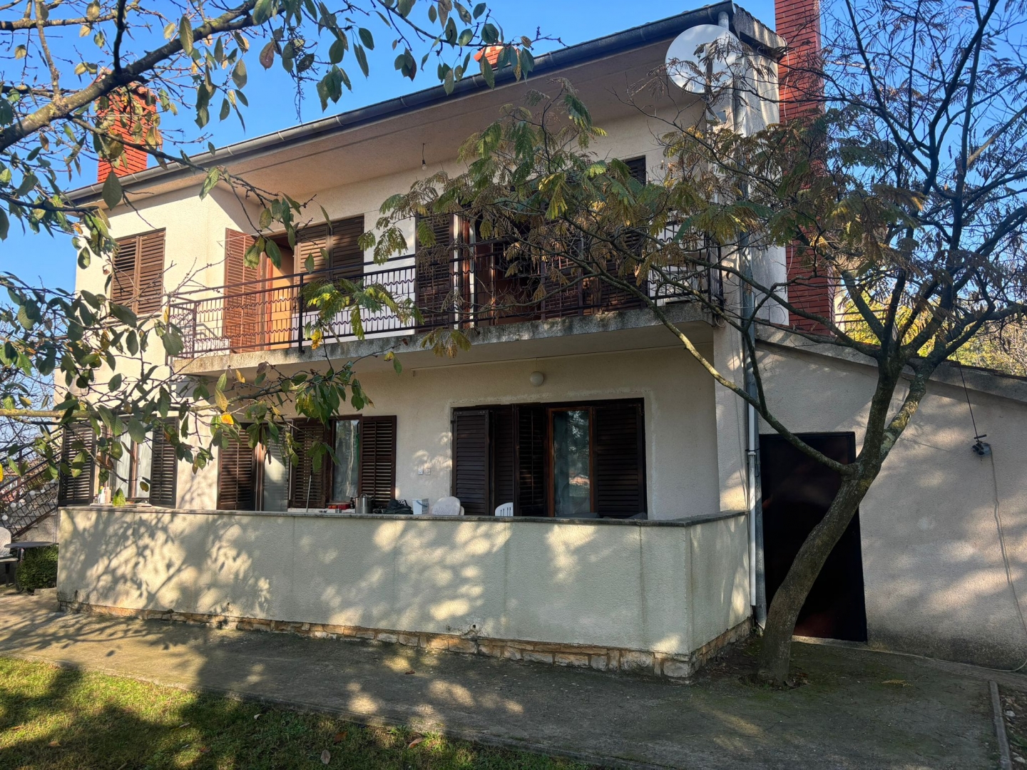Opis (Engleski): ISTRIA, POREČ (SURROUNDINGS) – Spacious house (built in 1985) with two large apartments and a garage on a 2,636 m² plot, including 1,687 m² of building land – a property full of potential and possibilities!A wide range of opportunities for its future owner! Just 7 km from the sea!The house consists of two spacious 3-bedroom apartments with living rooms and terraces, built in 1985 on a large plot of fully constructible land. The total land area is 2,636 m², of which 1,687 m² is within the building zone – the last plot in the construction area. This gives the new owner the opportunity to build additional residential units or to subdivide and sell individual parcels.The property also includes a garage of approximately 30 m² and an additional registered utility building currently used as a covered parking area and storage space. Heating is provided by a central oil heating system, with the option of wood heating as well – the ground-floor apartment features a fireplace, while the first-floor unit has a wood stove....