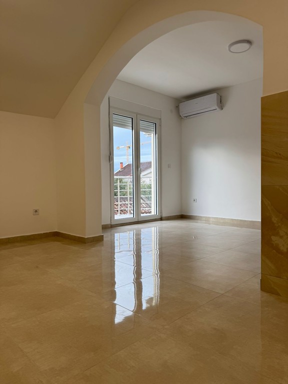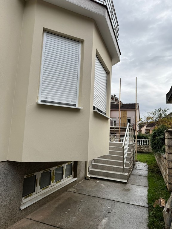 Kuća posjeduje dva nivoa i ograđeno dvorište sa parkingom.