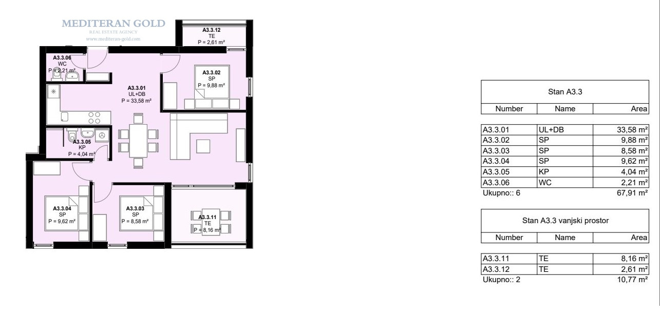 trosoban stan od 74,59m2, položen na drugom katu, cijena je 312.500€.