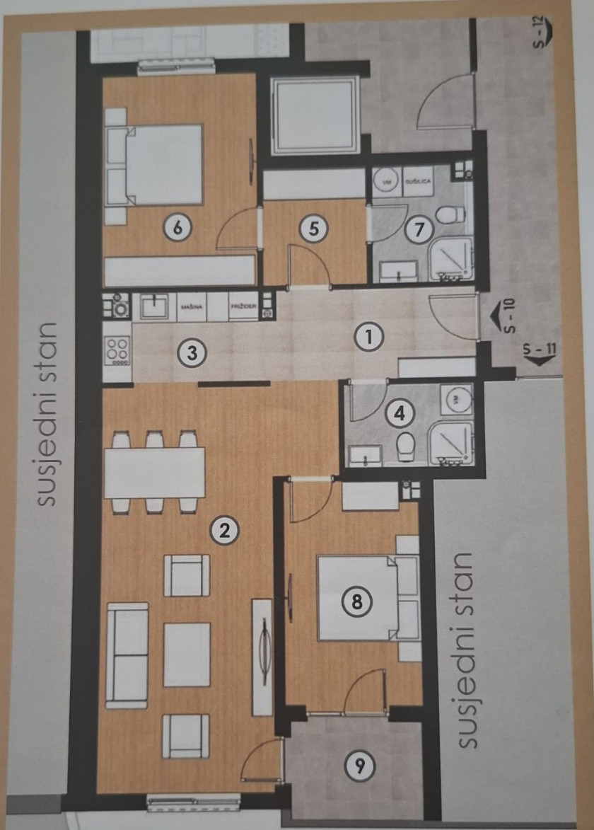 Stan se sastoji od dnevnog boravka, kuhinje sa trpezarijom, dvije odvojene spavaće sobe, kupatila i toaleta, hodnika te balkona. Prostran raspored prostorija pruža osjećaj udobnosti i funkcionalnosti, idealan za porodični život.