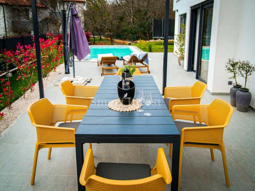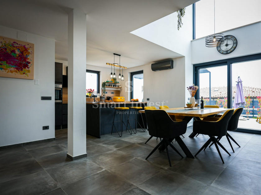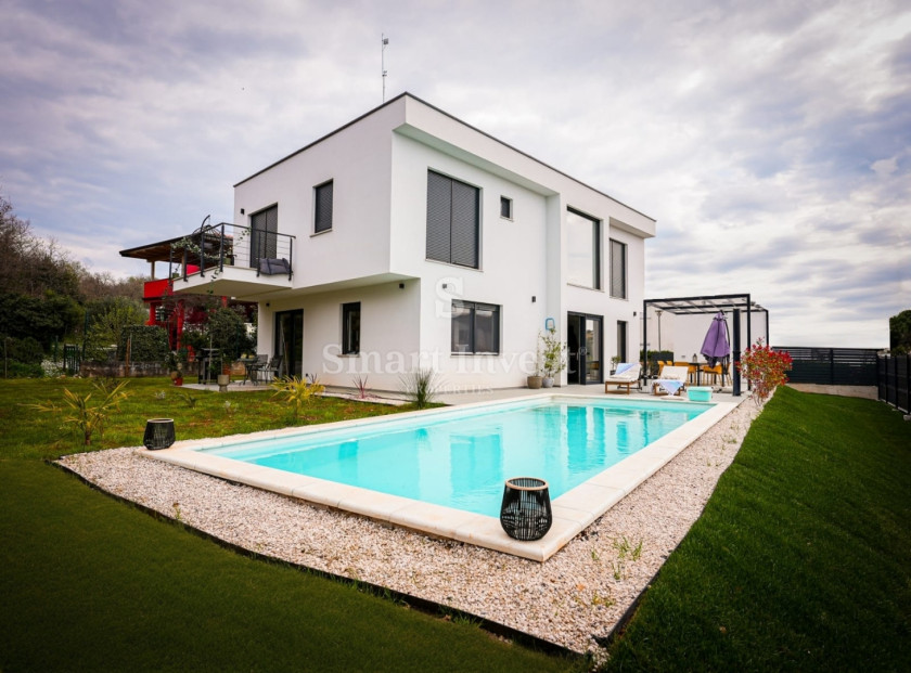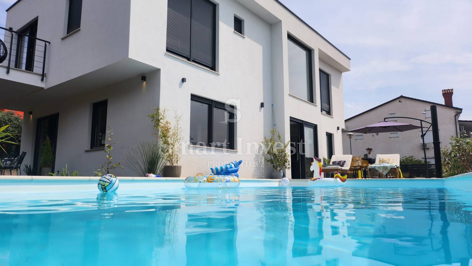 Na prodaju je nova moderna vila s bazenom smještena je na par minuta vožnje od mora (kamp i plaža Kanegra u Savudriji) i Umaga. U izgradnji su korišteni suvremeni materijali i oprema.