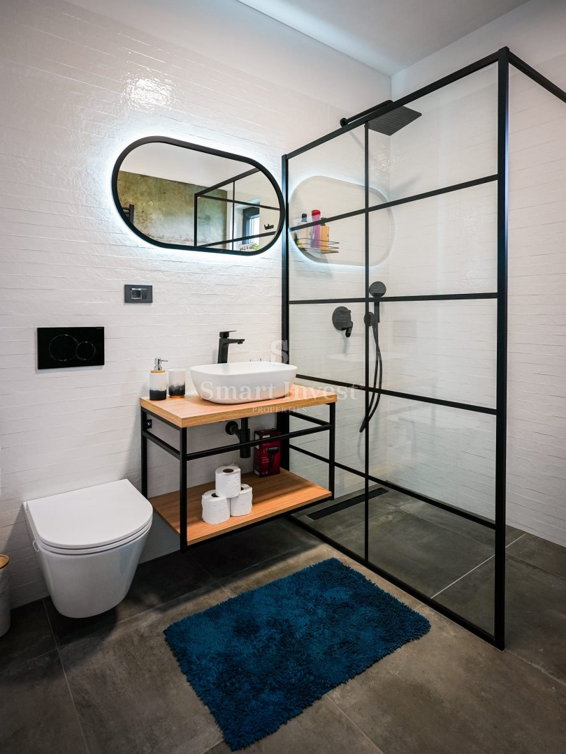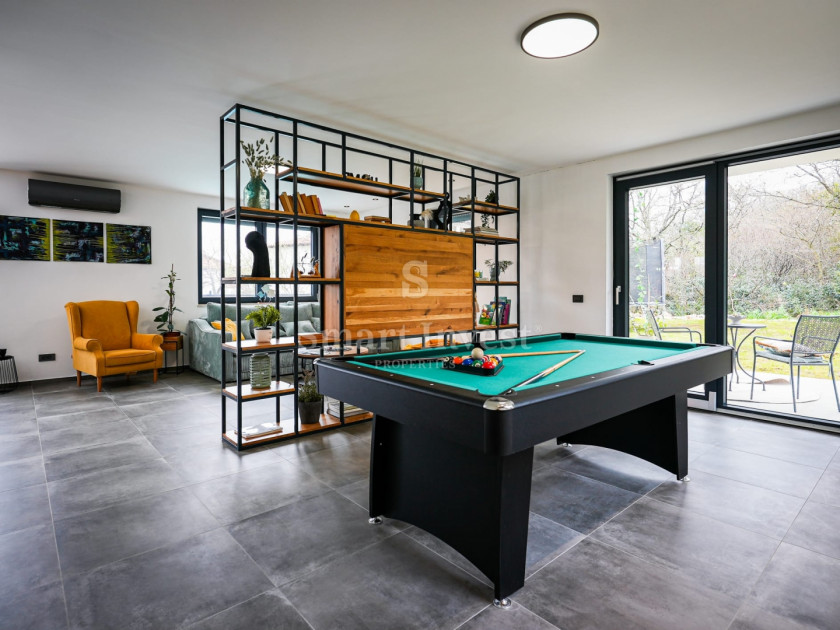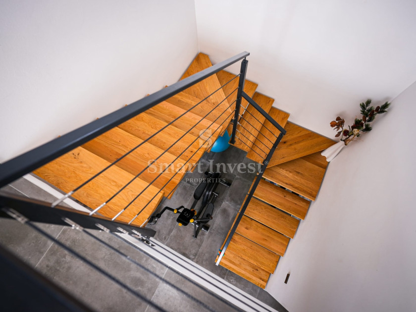 Kuća se prostire na dvije etaže: u prizemlju se nalazi open space dnevni boravak s kuhinjom i blagovaonicom, soba za zabavu, spremište, ostava i gostinski toalet. Iz prizemlja se izlazi u vrt s bazenom i sunčalištem, vanjskom blagovaonicom i roštiljem. Na katu su smještene tri spavaće sobe sa svojim kupaonicama. Grijanje i hlađenje putem split invert sistema klima uređaja, dok je podno grijanje u kupaonicama.