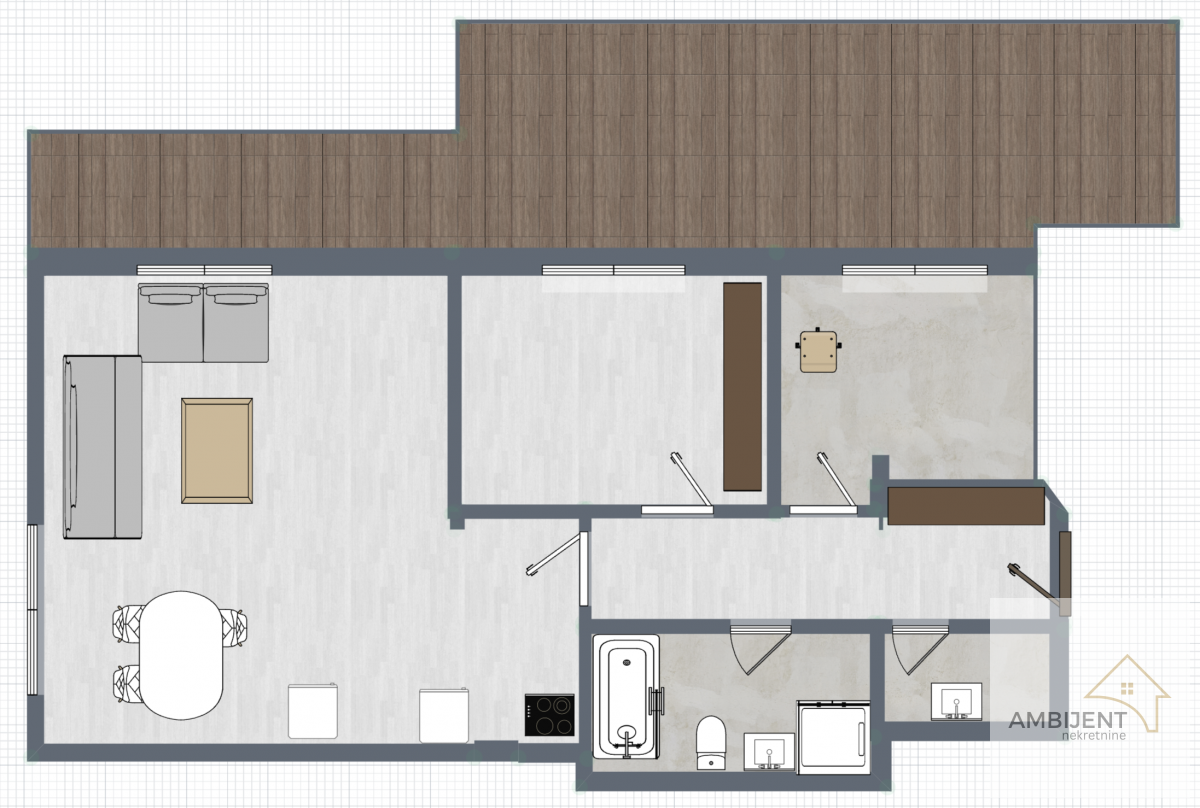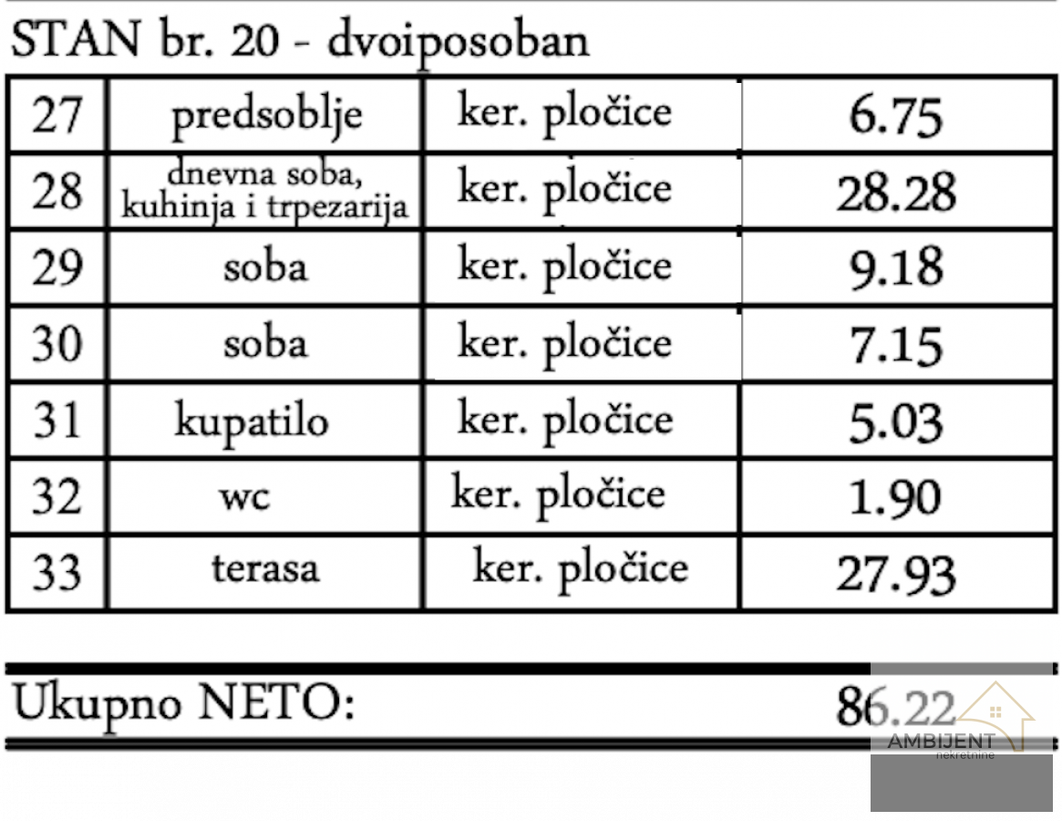 U ponudi je dvosoban stan ukupne površine 86.22 m2 u kvalitetnoj novogradnji u Pančevu, naselje Margita, kupovina direktno od investitora. Stan se odlikuje odlično organizovanim rasporedom prostorija i funkcionalnim korišćenjem svakog kvadrata; sastoji se od prostranog dnevnog boravka sa kuhinjom i trpezarijom, dve spavaće sobe, kupatila,wc, predsoblja i dve terase.