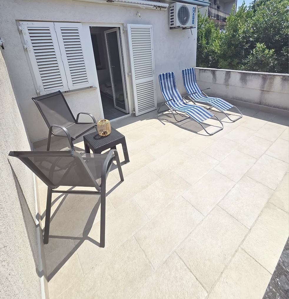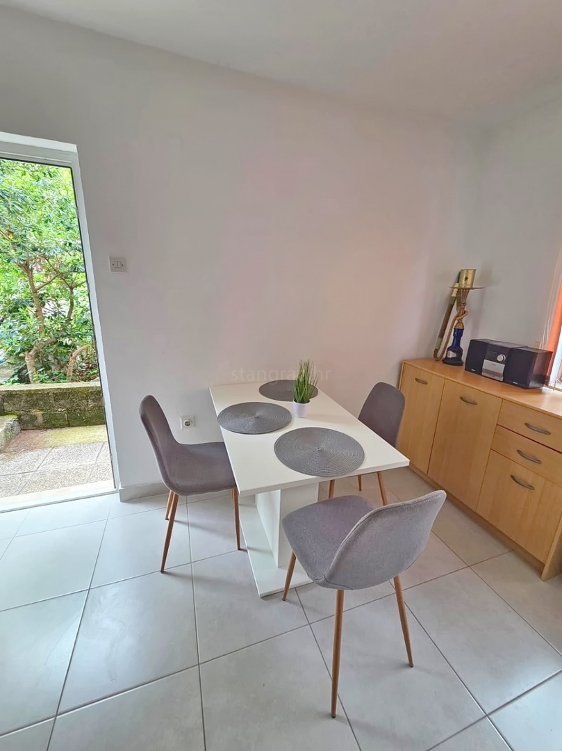Ovo je vrlo udobni, srednje veliki jednoetažni apartman vrlo dobrog rasporeda. Unutar lijepo građenog objekta, apartman se nalazi na prizemnoj etaži. Površina ovog apartmana iznosi ukupno 54 m2. U navedenoj površini sadržani su dnevni boravak i kuhinja s blagovaonicom, spavaća soba, kupaonica i prostrana terasa površine cca 13 m2. Unutarnji prostori nekretnine su osobito dobro održavani te u potpunosti opremljeni potrebnim tehničkim uređajima i vrlo kvalitetnim namještajem.