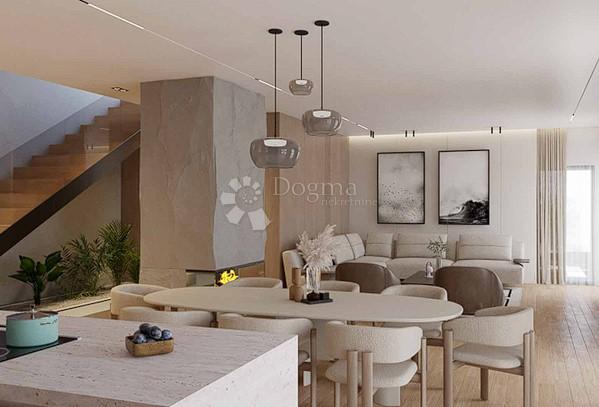 Prizemlje nudi prostrani dnevni boravak koji se elegantno nastavlja u modernu kuhinju i blagovaonicu, stvarajući idealan prostor za obiteljska okupljanja i druženja. U prizemlju se nalazi i jedna spavaća soba s vlastitom kupaonicom, pogodna za goste ili luksuzni primarni apartman. Dodatni sadržaji uključuju pretprostor saune, luksuznu saunu, potpuno opremljen fitness, sanitarije, praonicu, praktičnu ostavu te vanjsko spremište....