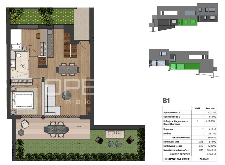 Opis: PRODAJA STANA, REMETE, NOVOGRADNJA, 79,63M2, 3-soban.Prodaje se vrhunska novogradnja na odličnoj, mirnoj lokaciji u jednom od najtraženijih dijelova grada u blizini Maksmirske šume, osnovne škole, internacionalnih škola na Fratrovcu, vrtića, prodavaonice, a autobusna linij koja vodi na Svetice i Kaptol je ispred same zgrade.Manja, luksuzna zgrada sa svega 4 stana osigurava osjećaj privatnosti i intime.U gradnji će biti korišteni samo vrhunski materijali i oprema (parket prve klase, vrhunska keramika i sanitarije premium brendova, unutarnja vrata sa skrivenim pantima i integriranim dovratnicima u ravnini zida), te visina stropova od 3,00m i velikim staklenim stijenama sa alu žaluzinama doprinijeti će osjećaju luksuza.Svaki stan dolazi sa jednim garažnim i jednim vanjskim parkirnim mjestom.Stan B1 stambene kvadrature 61,07m2 sa natkrivenom terasom i vrtom sastoji se od prostranog boravka sa kuhinjom i blagovaonicom, dvije spavaće sobe te ulaznog prostora i kupaonice.Rok dovršetka proljeće 2027.g.