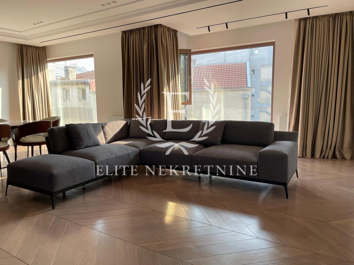 Izdaje se prelep, moderno i kvalitetno opremljen stan u luksuznoj novogradnji, površine 130 m². Stan se sastoji od prostranog dnevnog boravka u sklopu trpezarije, kompletno opremljene kuhinje, tri spavaće sobe, dva kupatila i posebnog toaleta, kao i terase koja pruža mir i komfor. Opremljen je vrhunskim nameštajem i tehnikom, sa pažljivo biranim detaljima i savršenim rasporedom prostorija. U cenu je uključeno i garažno mesto. Nalazi se u jednoj od najtraženijih lokacija u Beogradu – kod Hrama Svetog Save, u blizini svih potrebnih sadržaja, restorana i prodavnica. Stan se izdaje isključivo na duži vremenski period.