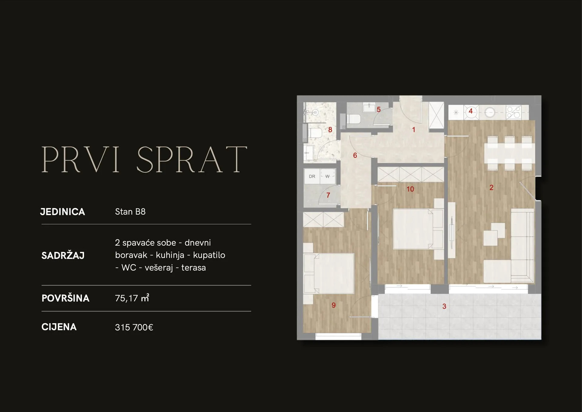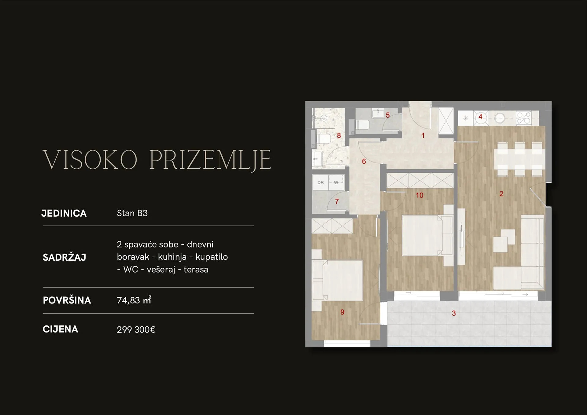 Stanovi su dostupni u različitim veličinama, od 57,60 m² do 74,83 m².