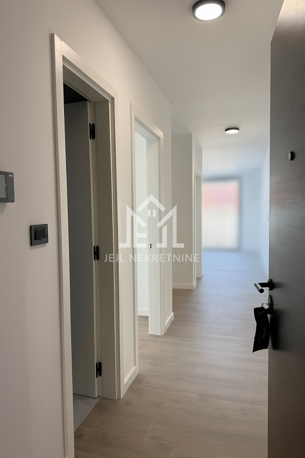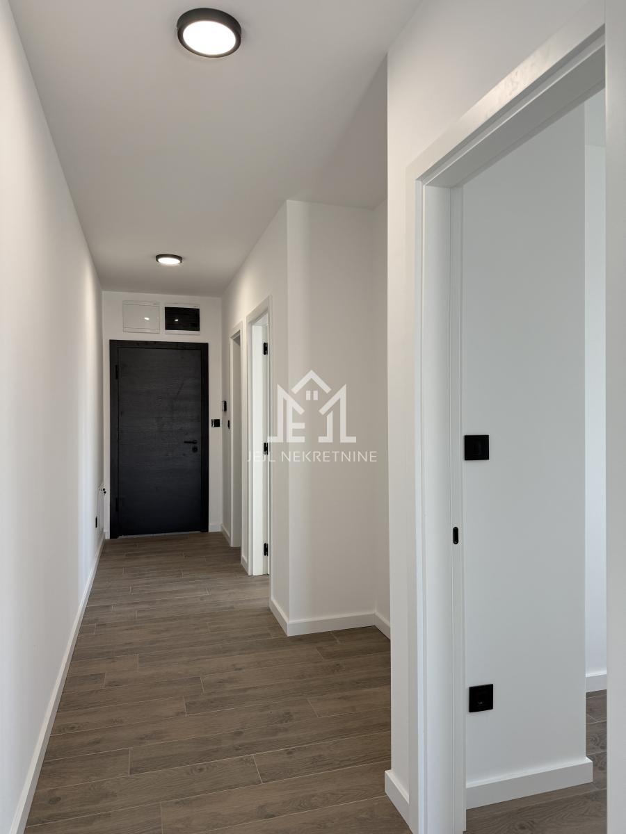 Raspored je odličan i praktičan: iz ulaznog hodnika (predviđeno mesto za ugradni plakar) levo se nalaze kupatilo, prva spavaća soba i druga spavaća soba, dok se na kraju hodnika ulazi u dnevni boravak sa kuhinjom i trpezarijom, uz izlazak na terasu.