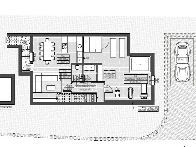 Vila se proteže na tri etaže – podrum, prizemlje i prvi kat. U podrumu se nalazi 82m² unutarnjeg prostora i 1m² otvorenog dijela. Podrum se sastoji od: konobe, WC-a, praone, wellnessa, teretane, hodnika i stubišta. Nadalje, prizemlje uključuje 74m² zatvorenog prostora te 34 m² vanjskog dijela s prostranom terasom, bazenom i pristupnim putem. U prizemlju se nalaze: hodnik, kupaona, spavaća soba, ostava, kuhinja s blagavaonicom te dnevni boravak i spremište.