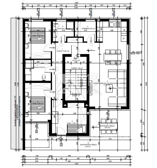 STAN NA 2. KATU OZNAKE "A4" (96,70 m2) uključuje: ulazni hodnik, dnevni boravak + kuhinju + blagovaonicu s izlazom na natkrivenu terasu, tri spavaće sobe, dvije kupaonice i spremište.