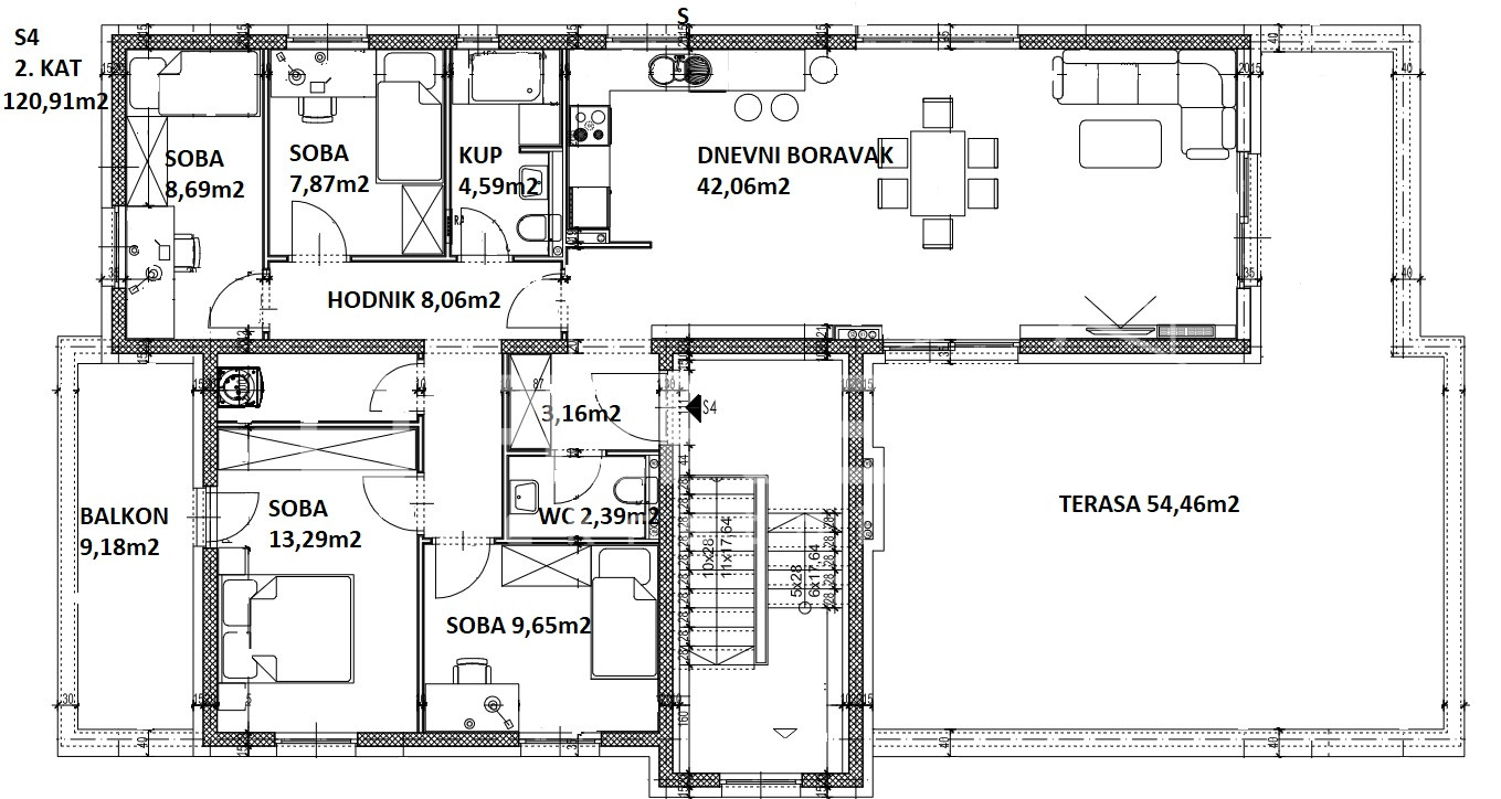 Opis: PRODAJA, STAN, VELIKA GORICA 66m2S4 Prodaje se 5 soban PENTHOUSE u novogradnji na 2. katu urbane vile sa samo 4 stana. Sami stan ima 102,71m2 bez terase i balkona. Sastoji se od "open space" dnevnog boravka s blagovaonicom i kuhinjom, četiri sobe, kupaonice s wc-om, odvojenog wc-a, ulaznog dijela i balkona na koji se izlazi iz spavaće sobe i terase od 54m2 na koju se izlazi iz dnevnog boravka. Novo naselje u izgradnji na odličnoj lokaciji. U blizini u planu izgradnja osnovne škole. Početak gradnje u 6/25 i planirani završetak 6/26.
