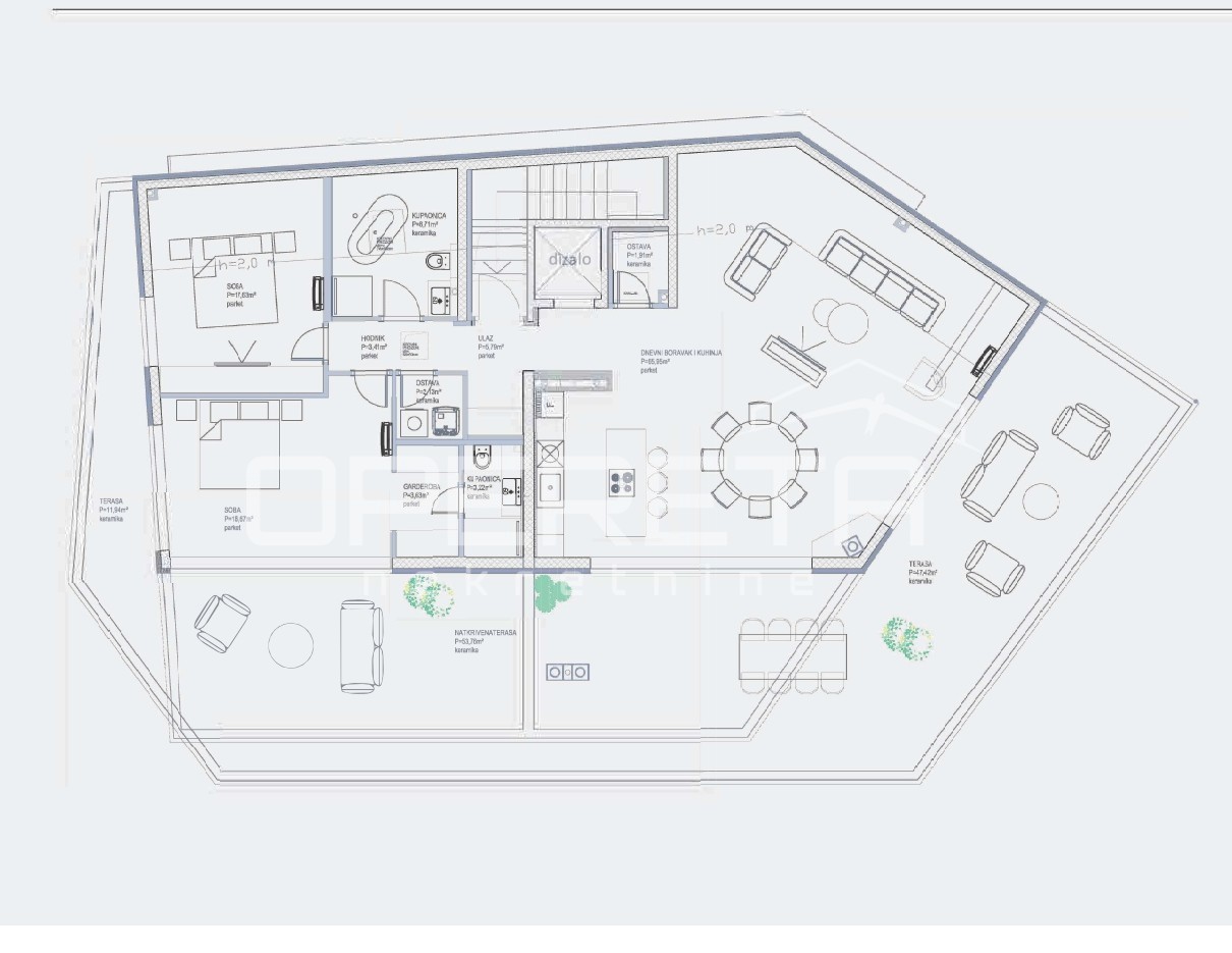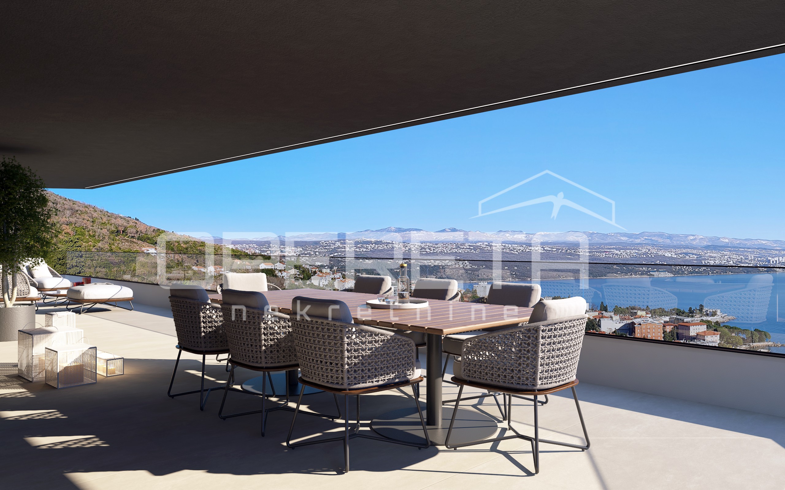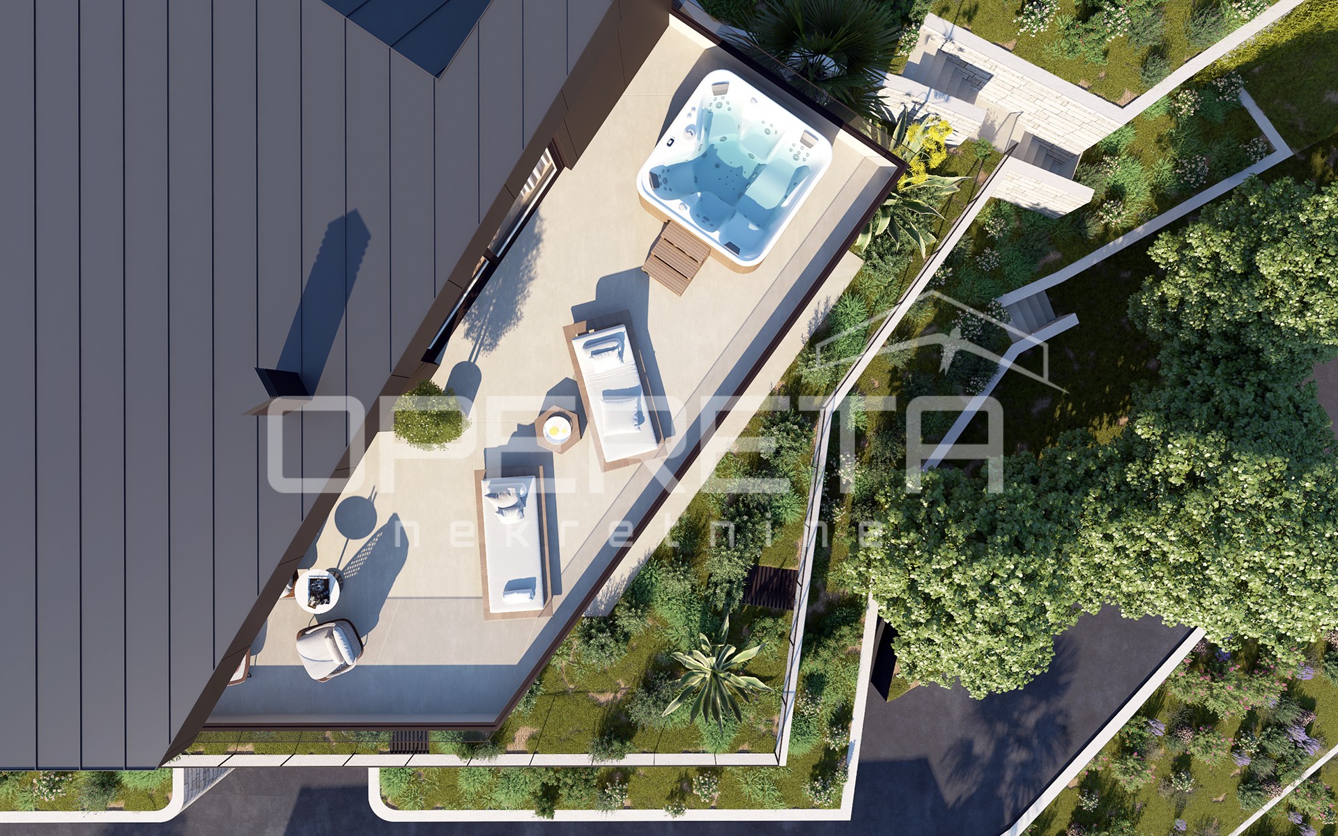 Opis: Predstavljamo vrhunski stan u novogradnji koji objedinjuje suvremeni dizajn, napredna tehnička rješenja i iznimnu razinu udobnosti. Smješten u tihoj, rezidencijalnoj zoni Opatije, ova nekretnina nudi rijetku kombinaciju privatnosti, funkcionalnosti i neposredne blizine svim važnim sadržajima.Stan se odlikuje modernom i minimalističkom arhitekturom, s naglaskom na čiste linije, maksimalnu iskoristivost prostora, i obilje prirodne svjetlosti zahvaljujući velikim staklenim stijenama koje omogućuju otvoren pogled na okolinu. U procesu izgradnje primijenjeni su najnoviji građevinski materijali i tehnologije koje osiguravaju visoku energetsku učinkovitost, izvrsnu toplinsku i zvučnu izolaciju te dugoročnu održivost objekta.Tlocrtno, stan se sastoji od prostranog open-space dnevnog boravka s blagovaonicom i kuhinjom, dvije udobne spavaće sobe – od kojih glavna ima vlastitu kupaonicu – dodatne kupaonice i spremišta. Sve glavne prostorije imaju direktan izlaz na veliku privatnu terasu, čime se prostor dodatno otvara i povezuje s vanjskim okruženjem....