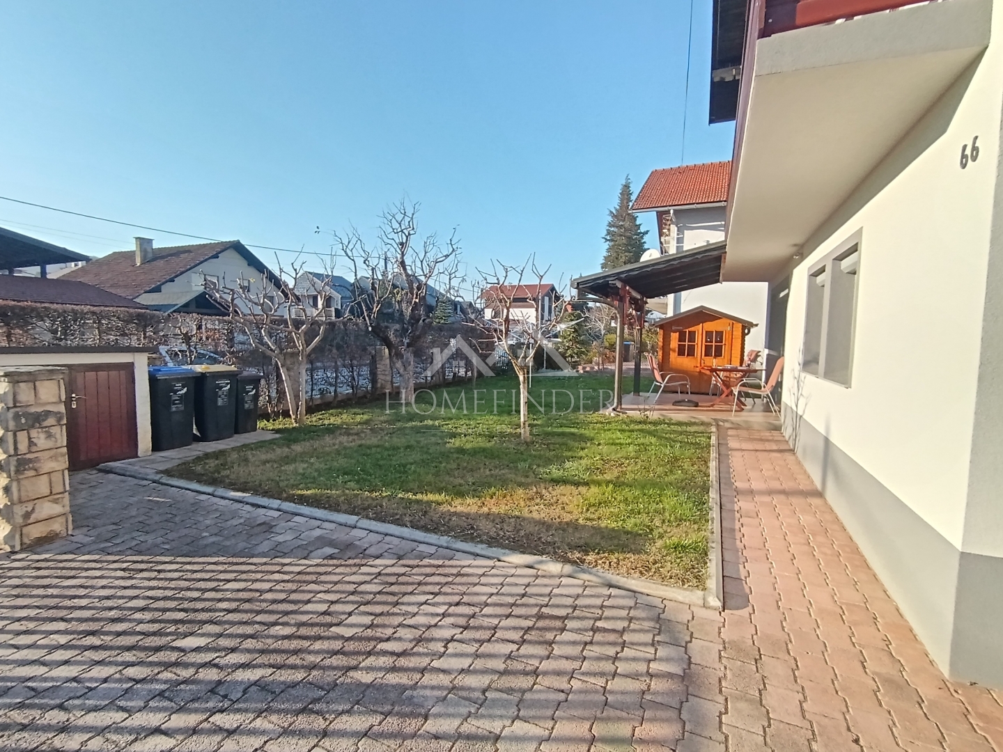 Dvorište je lijepo, ravno i dovoljno prostrano za dječju igru, a opet ne preveliko pa nema previše posla oko održavanja. U sklopu dvorišta nalazi se i ugodna nadstrešnica – savršena za jutarnju kavu ili večernji odmor u miru. Dio dvorišta se dijeli s još jednom kućom (tlocrt priložen u slikama)....