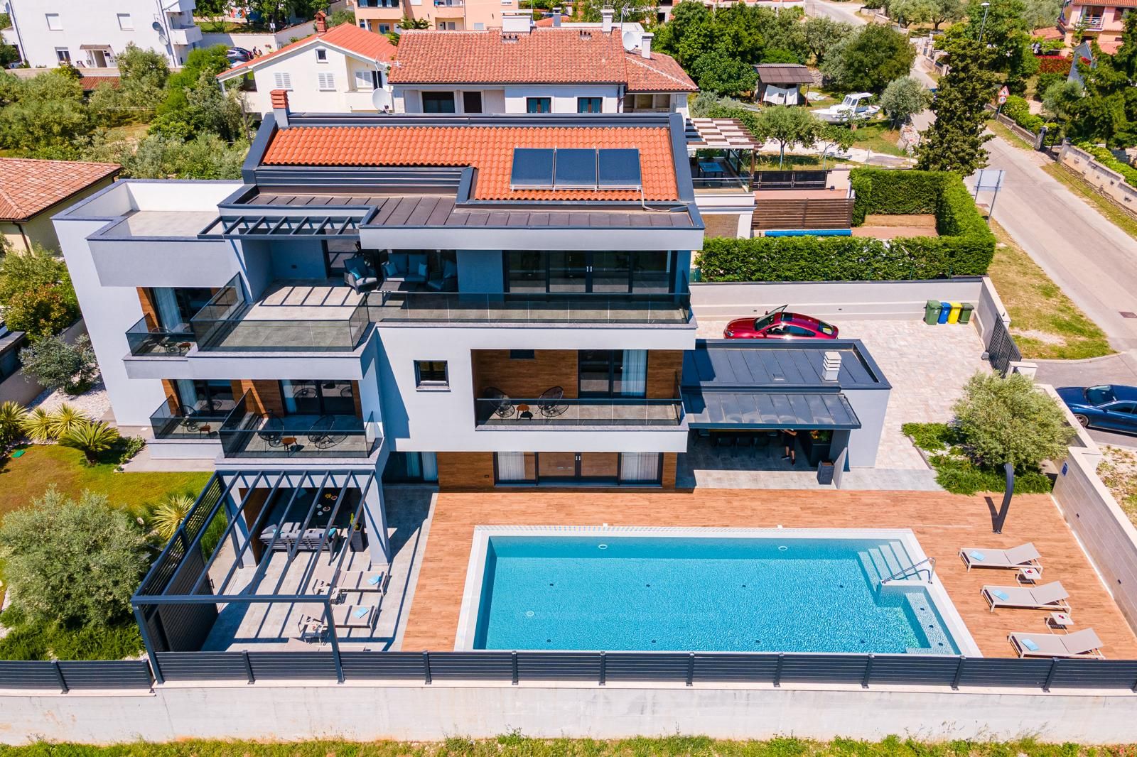 Opis (Engleski): A modern holiday villa is located in a prime position in Fažana, just 600 meters from the sea. The villa offers 350 m² of living space on a 900 m² plot, combining contemporary design with comfort and functionality. Built in 2019, the property features stylish interiors and 70 m² of spacious terraces, along with sophisticated equipment including air conditioning, TVs, and en-suite bathrooms in every bedroom.The ground floor includes a large open-plan living room, kitchen, and dining area with direct access to an attractive pool and outdoor summer kitchen, as well as one bedroom with a bathroom. The first floor houses three additional bedrooms, each with its own bathroom, while the second floor is dedicated to a fully equipped fitness center with professional exercise equipment and access to a large terrace overlooking the Adriatic Sea.The villa also offers the option to purchase an additional 700 m² building plot in front of the property, providing enhanced privacy....