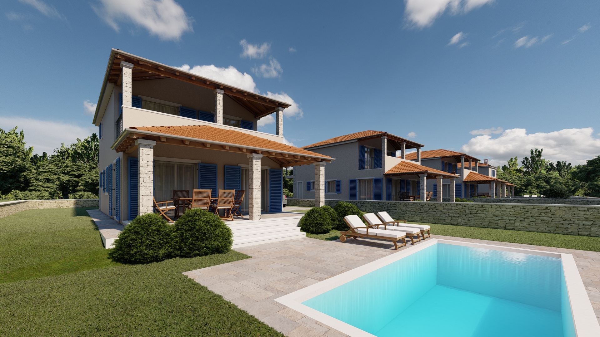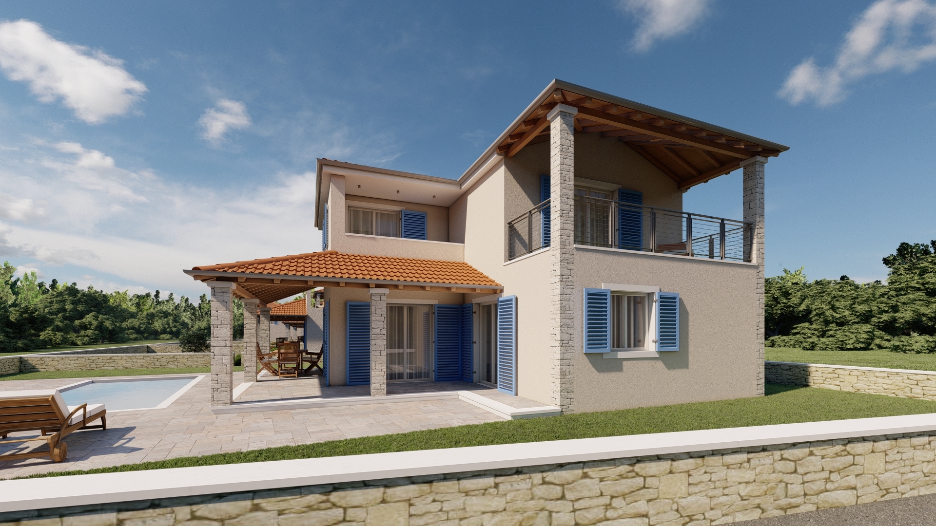 Opis (Engleski): A beautiful villa in a high ROH BAU stage is available just 1,500 meters from the sea in Liznjan near Pula, offering 166 m² of living space on a 444 m² land plot. This project presents a carefully designed villa that harmoniously blends traditional Istrian architecture with modern elements in an exceptional location.The villa is part of a small settlement concept comprising six houses, situated in a quiet area close to the beaches of Ližnjan and Medulin. The project is a rare opportunity on the southern coast of Istria, combining proximity to the Adriatic Sea with thoughtful design. Each house is planned with wooden shutters that reflect the authentic Istrian spirit, and the exterior layout is designed to maximize privacy and aesthetic appeal.All necessary permits and utility contributions have been obtained and paid. The listed price refers to the ROH BAU phase and includes the house under the roof, boundary walls, sheet metal work, and exterior carpentry. There is also the option, by agreement, for the investor to complete the building....