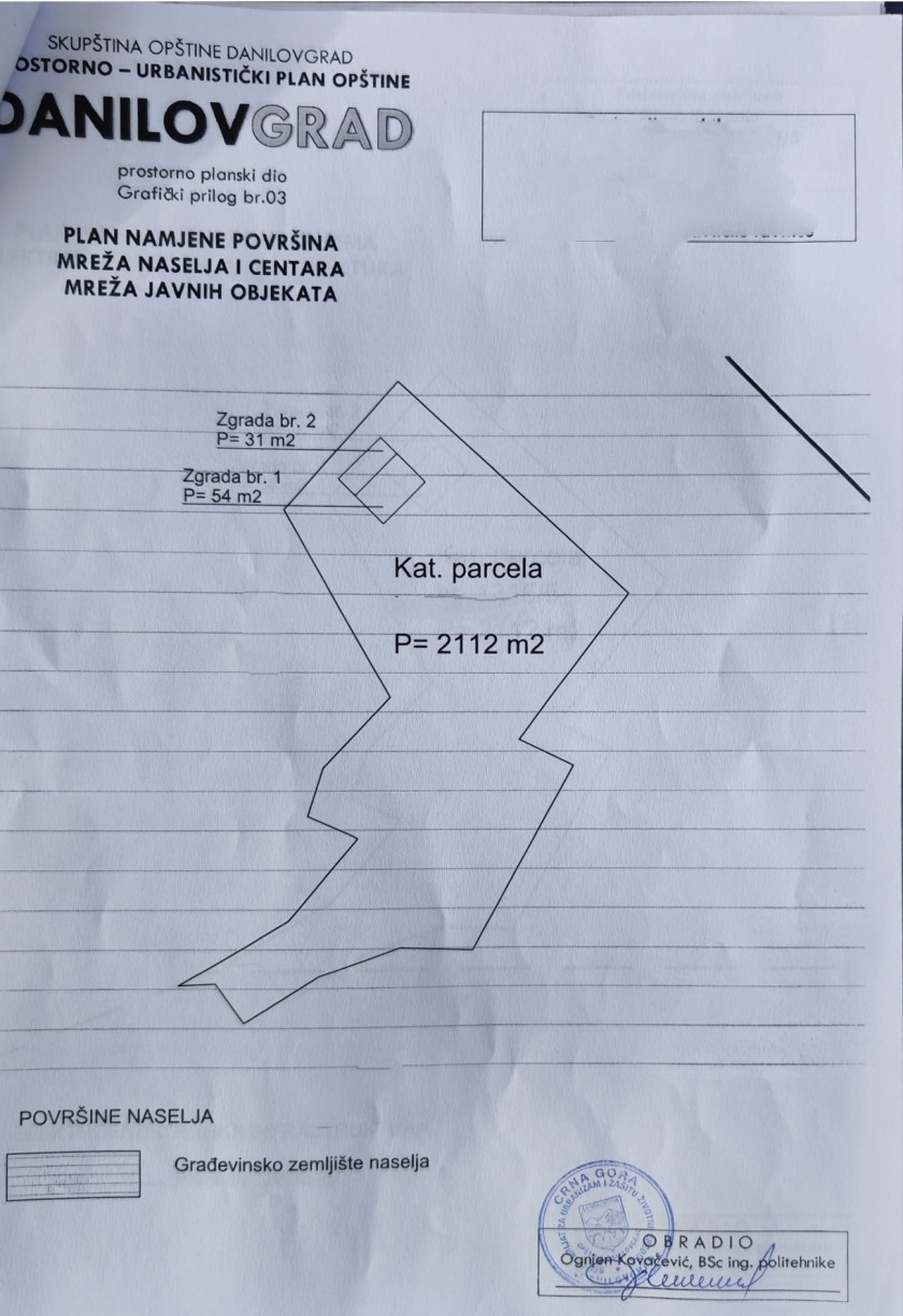 Vrsta: Prodajem Građevinsko Zemljište Područje: Danilovgrad Lokacija: Novo Selo Cijena: €115.000 Zemljište: 2.112 m2