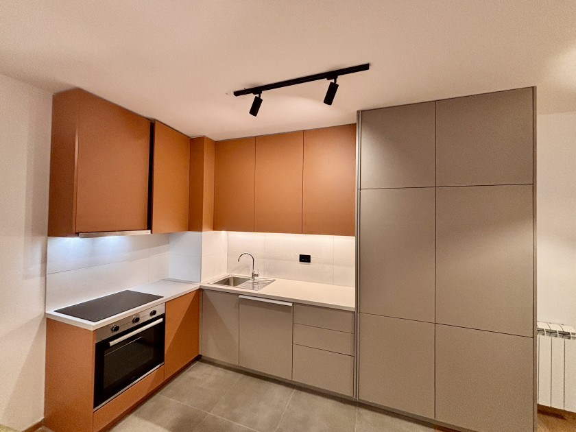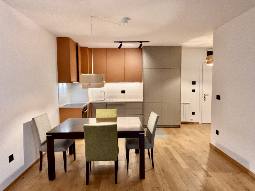 Stan je kompletno i moderno namešten, opremljen novom belom tehnikom: ugradni frižider, sudomašina, rerna, indukciona ploča, aspirator, veš mašina, TV i klima uređaj.