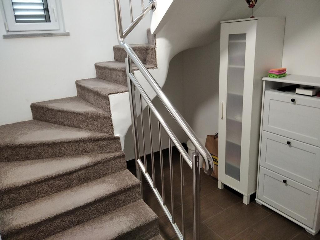 Struktura: na visokom prizemlju se nalazi gornji dio stana-veliki dnevni boravak, kupatilo sa tus kabinom, posebno trpezarija sa kuhinjom i izlazom na lijepu terasu. Stepenice vode do donjeg dijela stana gdje su 3 komforne spavace sobe, veliko kupatilo i predsoblje sa prostorom za garderober (donji dio stana se nalazi polusuterenu-sve sobe imaju dnevnu svjetlost, visoki su prozori).