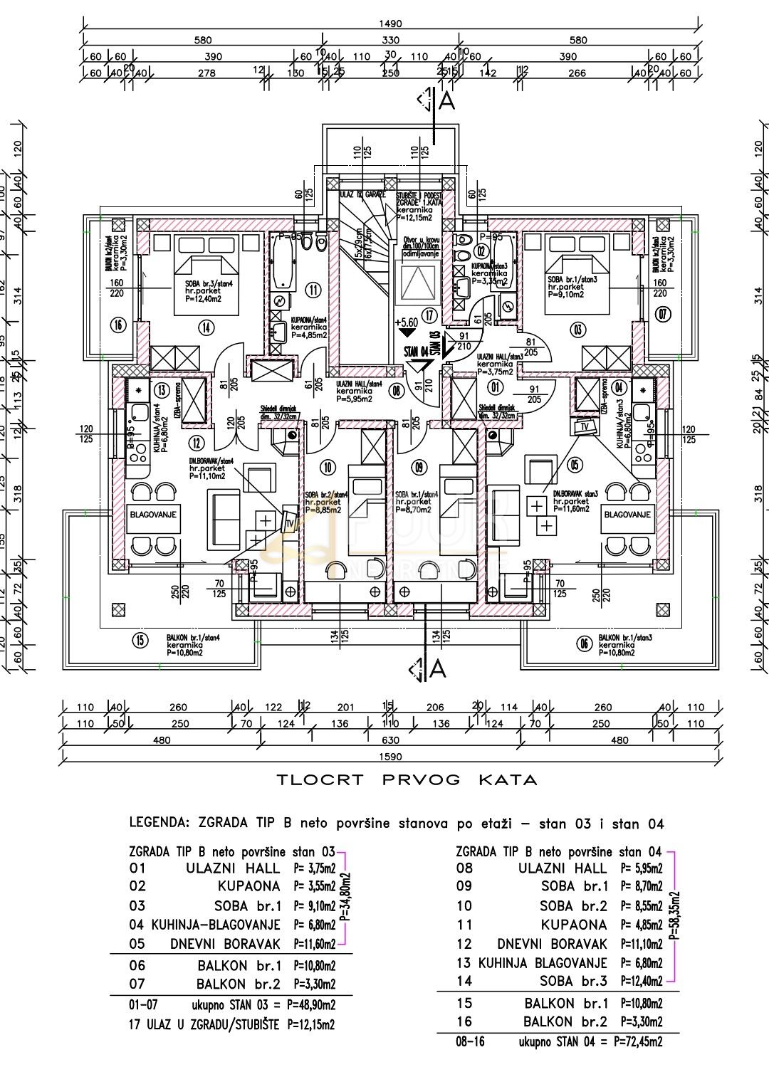 Stan je površine 48.90m2 s pripadajućim spremištem od 7.75m2, što čini sveukupno 56.65m2.