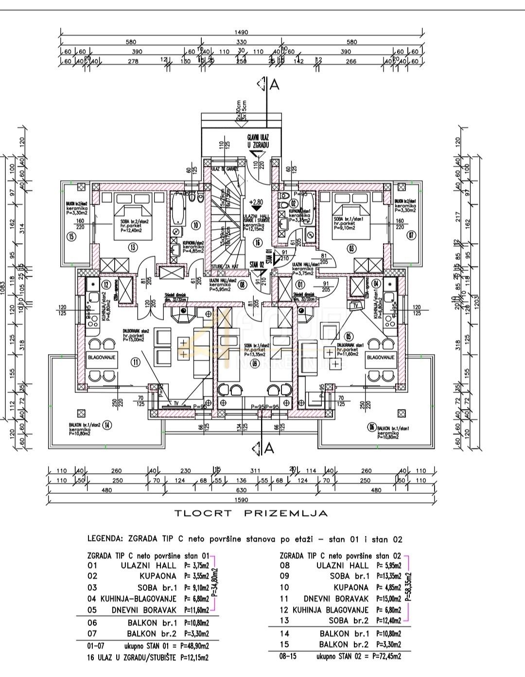 Stan je površine 48.90m2 s pripadajućim spremištem od 7.75m2, što čini sveukupno 56.65m2.