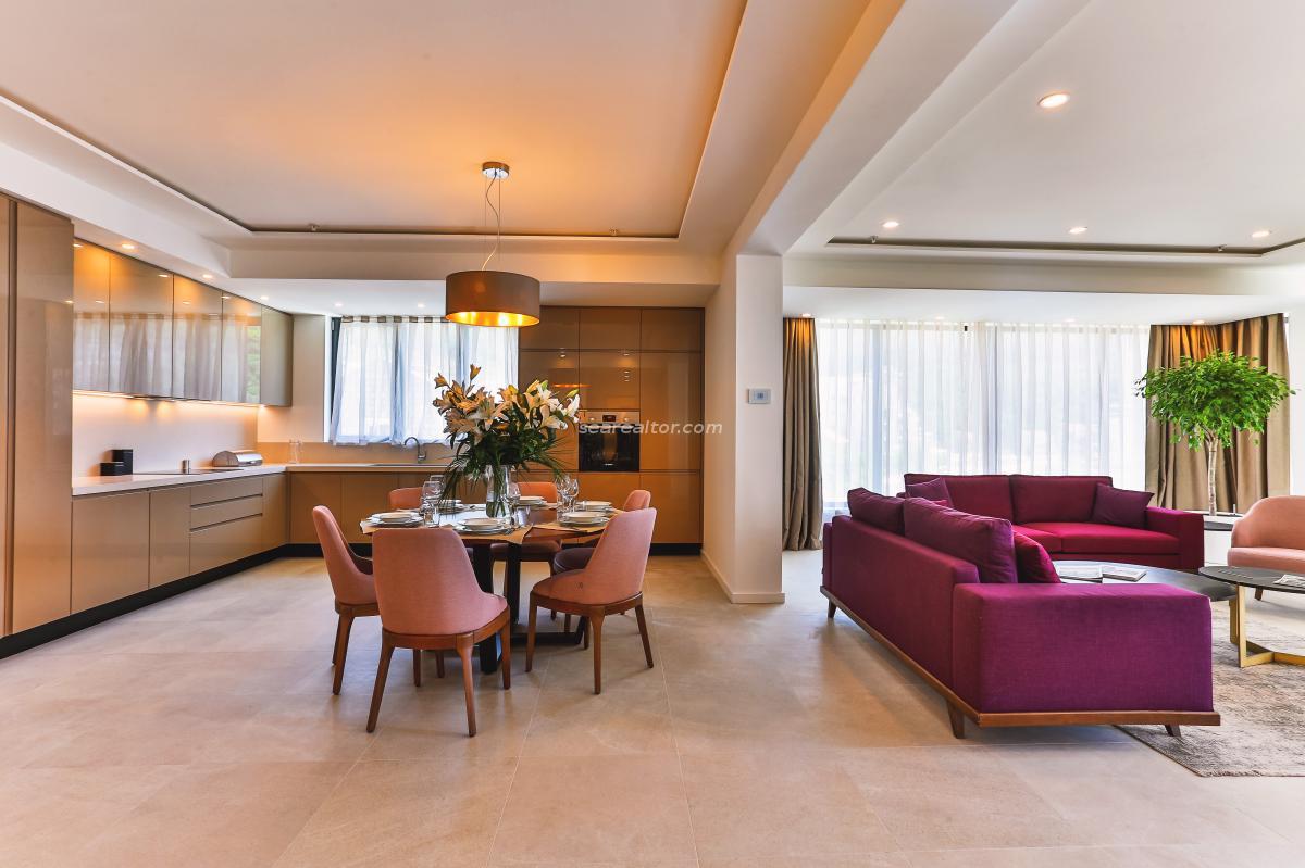 The interiors reflect a refined Mediterranean minimalism focused on light and space. Built-in furniture is made from glossy MDF, kitchen countertops from Corian® by DuPont, and upholstered furniture features fire-resistant, easy-to-clean, and moisture-repellent fabrics. Master bedrooms are equipped with king-size beds and blackout curtains for restful sleep. Each apartment is move-in ready, complete with modern appliances, quality textiles, and tableware. Designer furniture and tasteful décor create a warm, elegant atmosphere throughout.