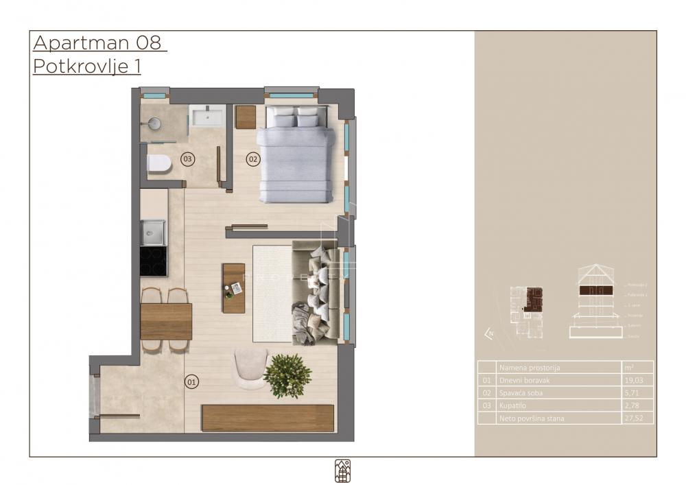 Stan se sastoji od: ulaznog hodnika, dnevno trpezarijskog dela sa kuhinjom, spavaće sobe i toaleta.