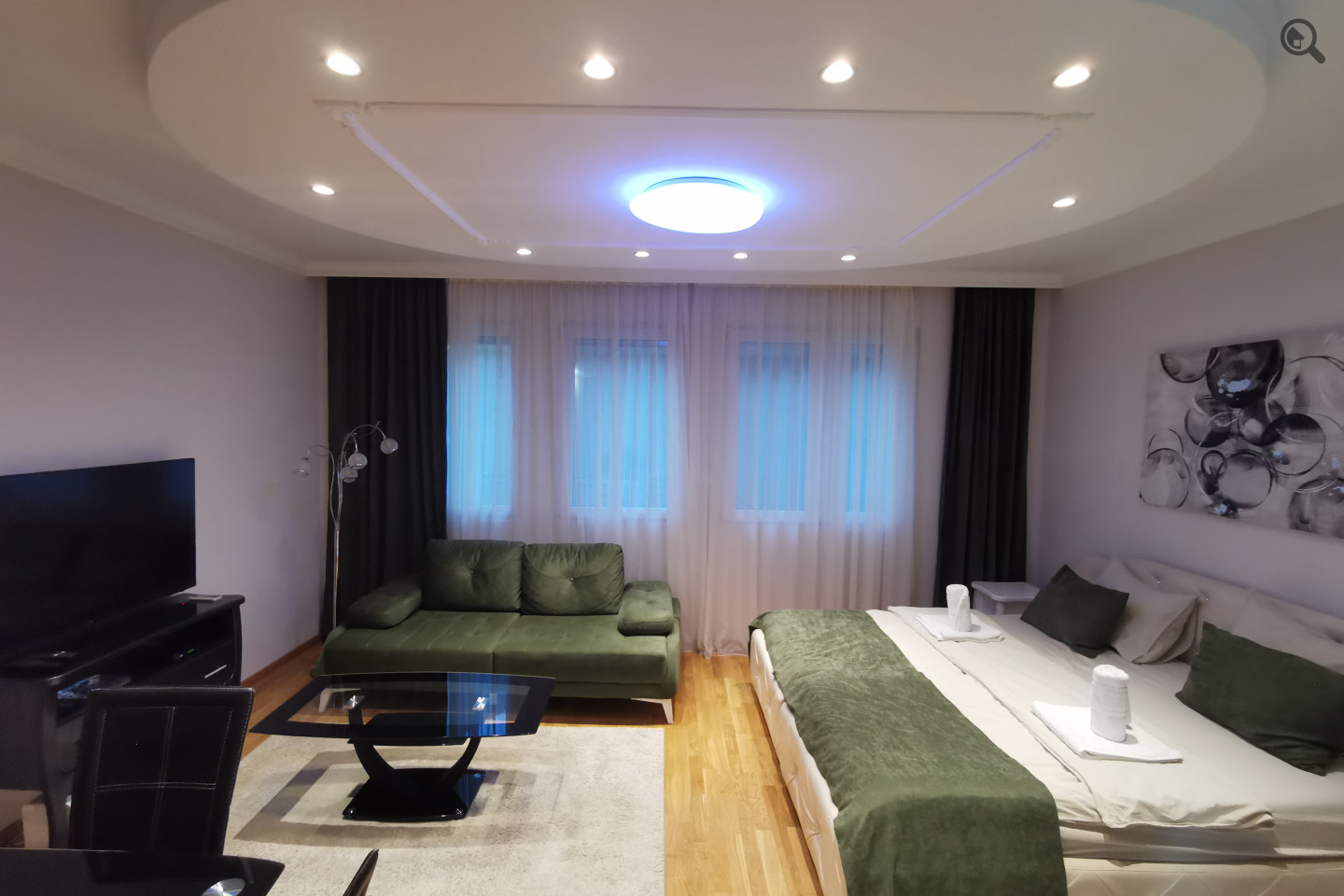 Opis: Apartman Fortuna Lux smešten je na prizemlju nove luks zgrade, u širem centru Beograda, nedaleko od Vukovog spomenika. Stan je lociran prema unutrašnjem delu zgrade, tako da vladaju apsolutni mir i tišina, čime je obezbeđena potpuna privatnost gostiju. To je moderan, prijatan i potpuno opremljen apartman za duži ili kraći boravak do 3 osobe. Apartman se sastoji od dnevnog boravka koji je spojen sa trpezarijom i kuhinjom. U centralnom delu sobe dominira bračni krevet, dimenzija 2x2 metra. Trosed je na razvlačenje, tako da se lako pretvara u veoma udoban ležaj za spavanje. Kupatilo sadrži tuš kabinu, ugradne sanitarije, fen za kosu i veš mašinu. Rešetka za sušenje veša, pegla i daska za peglanje su takođe na usluzi. Apartman ima centralno grejanje, bežični internet, kablovsku televiziju, LCD TV i interfon. Gostima je na raspolaganju garažno mesto koje je uključeno u cenu. (Napomene za garažni lift- dimenzije: D-4.2m x V-1.9m x Š-1....