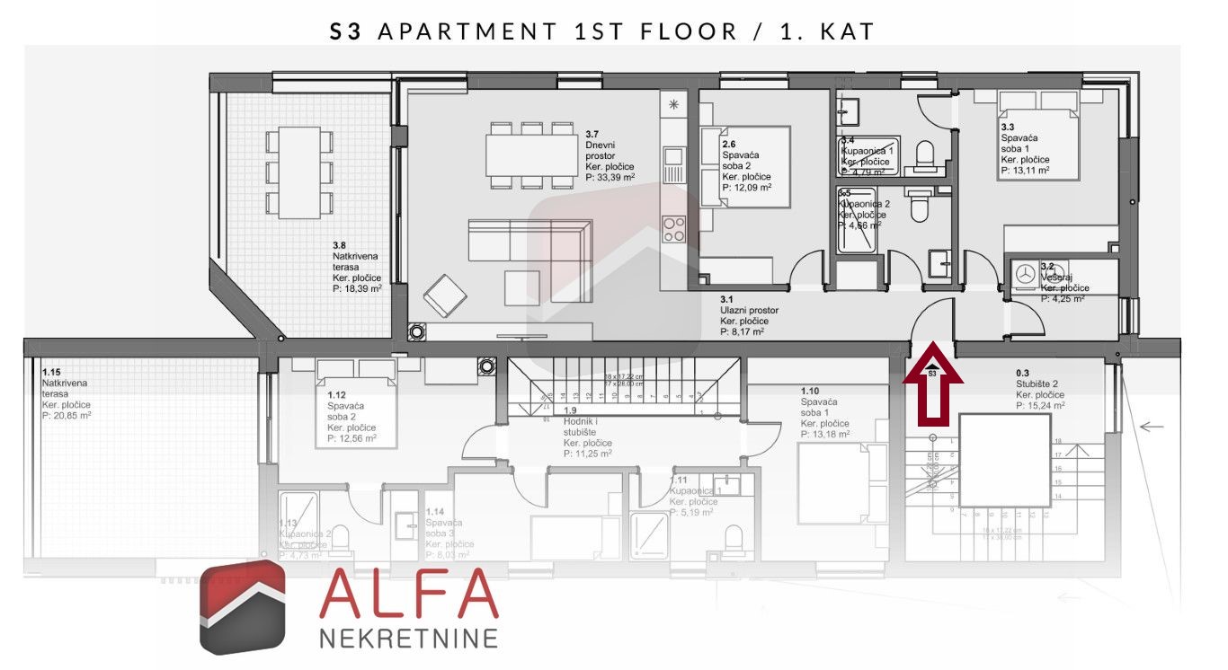 Stan S3 ima sveukupno sa redukcijskim obračunskim koeficijentima ukupnu korisnu vrijednost površine od 97,28 m2. Samo unutarnji stambeni prostor ima 80,46 m2 + velika natkrivena terasa od 18,39 m2 te ispred zgrade jedno parkirno mjesto od 15,13 m2.