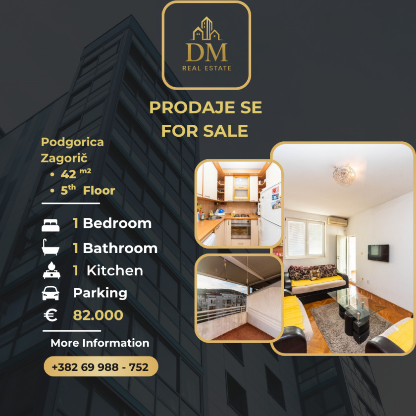 ✨ Na prodaju jednosoban, kompletno namješten stan u Zagoriču, u blizini MUP-a. Stan je površine 42 m² (38 m² uknjiženo u posjedovnom listu), nalazi se na 5. spratu zgrade bez lifta i uknjižen je bez tereta.