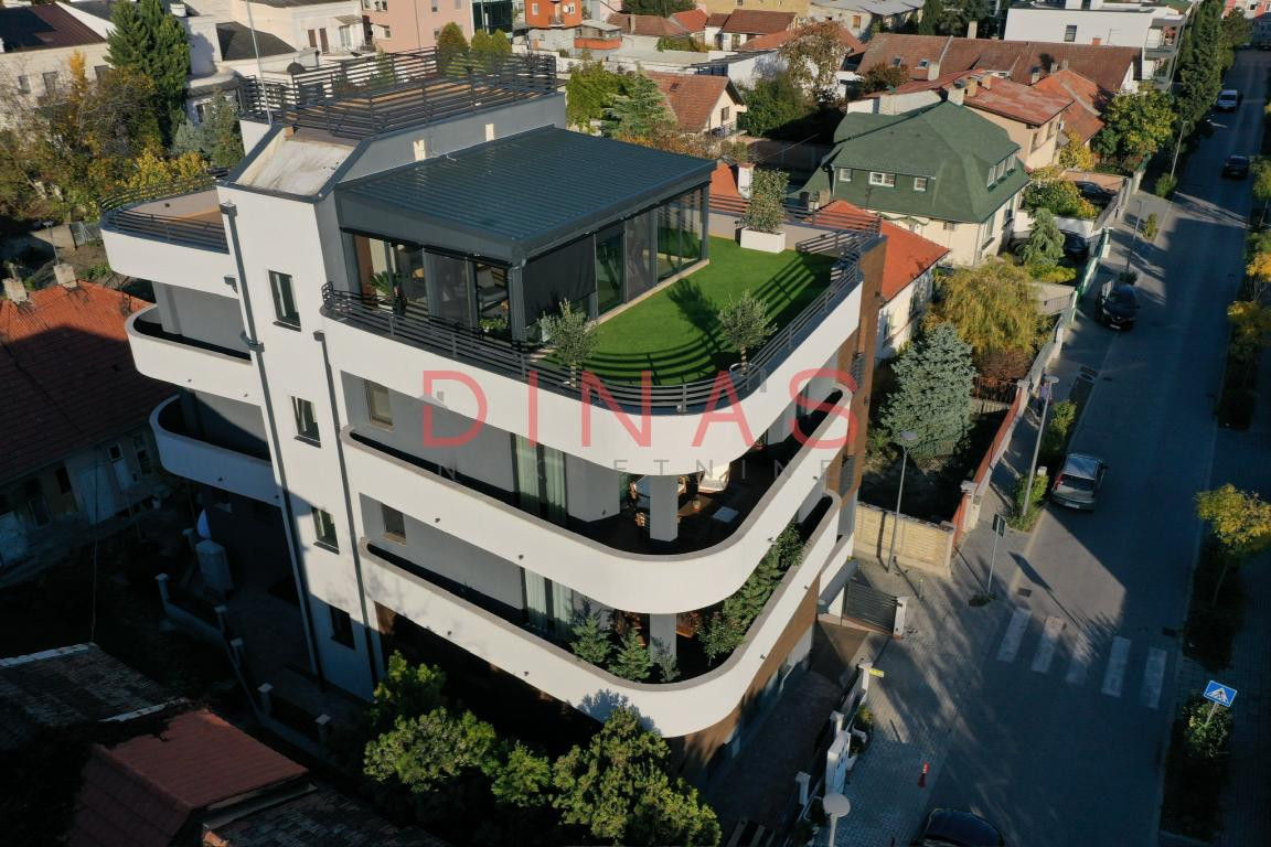 Opis: Na prodaju ekskluzivan penthaus površine 208m² sa spektakularnom krovnom terasom od 200m², koji pruža savršen spoj luksuza, komfora i mira, uz neposrednu blizinu centra grada. Stan je petosoban, moderno i kvalitetno opremljen, sa pažljivo odabranim materijalima i elegantnim enterijerom. Prostor je svetao i prostran, sa velikim staklenim površinama koje pružaju prelep pogled i obilje prirodne svetlosti. Mogućnost kupovine dva garažna mesta. Cena jednog garažnog mesta iznosi 20.000 eur.
