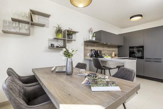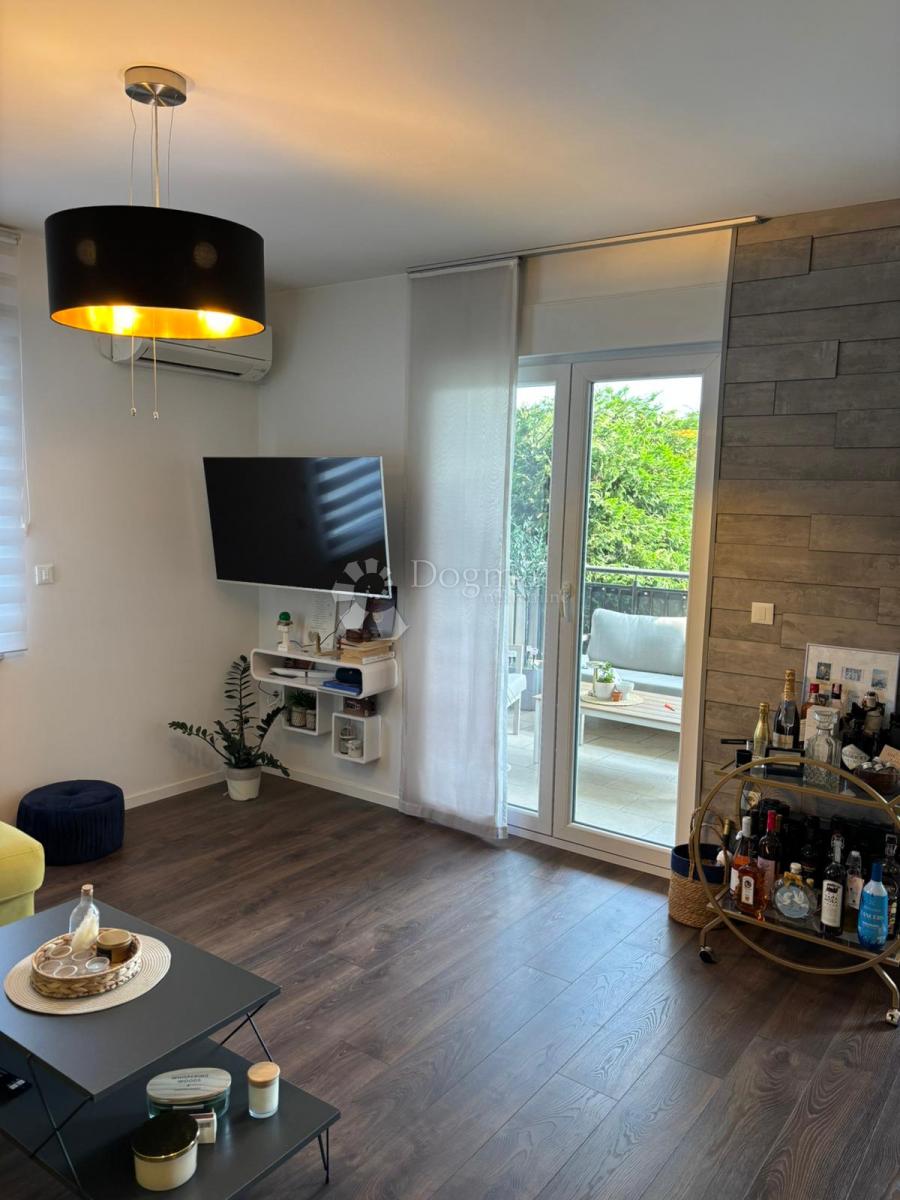 Stan je promišljeno organiziran kao 2S+DB i sastoji se od hodnika, dviju komfornih spavaćih soba, moderne kupaonice s podnim grijanjem, te velikog otvorenog prostora koji povezuje kuhinju, blagovaonicu i dnevni boravak. Iz dnevnog dijela izlazi se na balkon i natkrivenu terasu opremljenu vertikalnim tendama koje pružaju privatnost i zaštitu od sunca, čineći je savršenim prostorom za boravak na otvorenom tijekom većeg dijela godine. Poseban ugođaj stanu daje peć na drva, dok je sigurnost i cjelogodišnja ugodna temperatura osigurana ugrađenim klima inverterom za grijanje i hlađenje....
