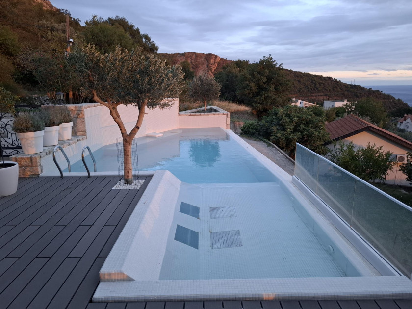 Pored prilaza nalazi se stilski bazen sa infiniti tehnologijom slane vode. Garaža se nalazi ispod bazena.