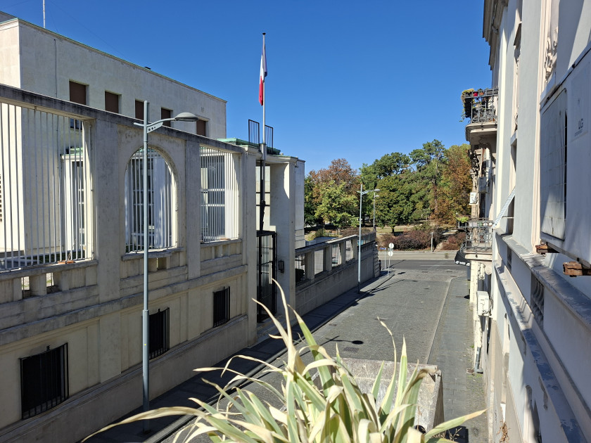 Terasa je okrenuta ka ulici, gleda na Francusku ambasadu, Kalemegdan i Sabornu crkvu
