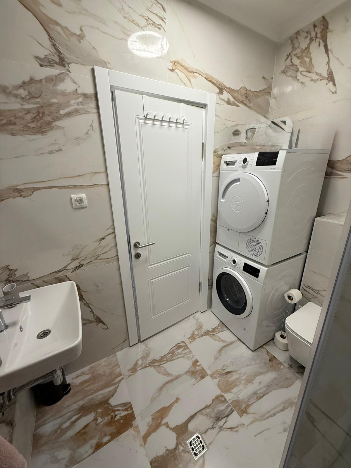 Stan je kompletno opremljen novim namještajem i bijelom tehnikom, uključujući mašinu za pranje i sušenje veša.