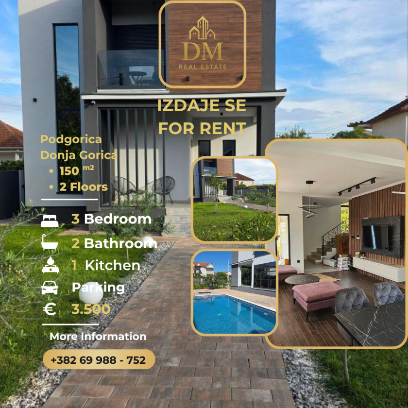 Opis: 🏡 Izdaje se Luksuzna Trosobna Kuća sa Bazenom – Donja Gorica, Podgorica