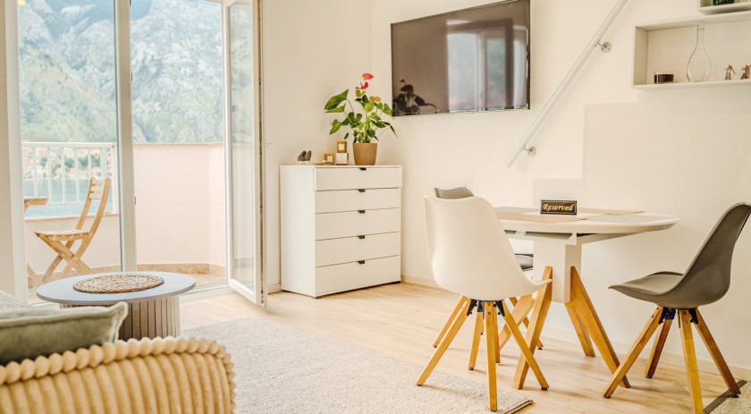 Stan se sastoji od dnevne sobe sa kuhinjskim delom i drugog nivoa gde se nalazi prostor za spavanje, spavaća soba i kupatilo i dve terase sa pogledom na Bokokotorski zaliv i Stari grad Kotor.