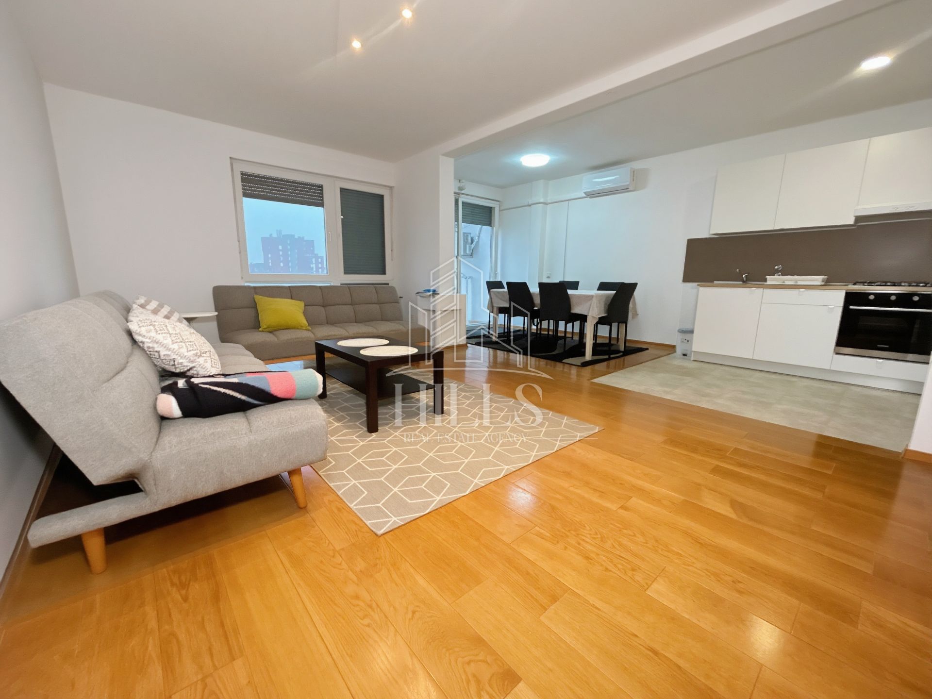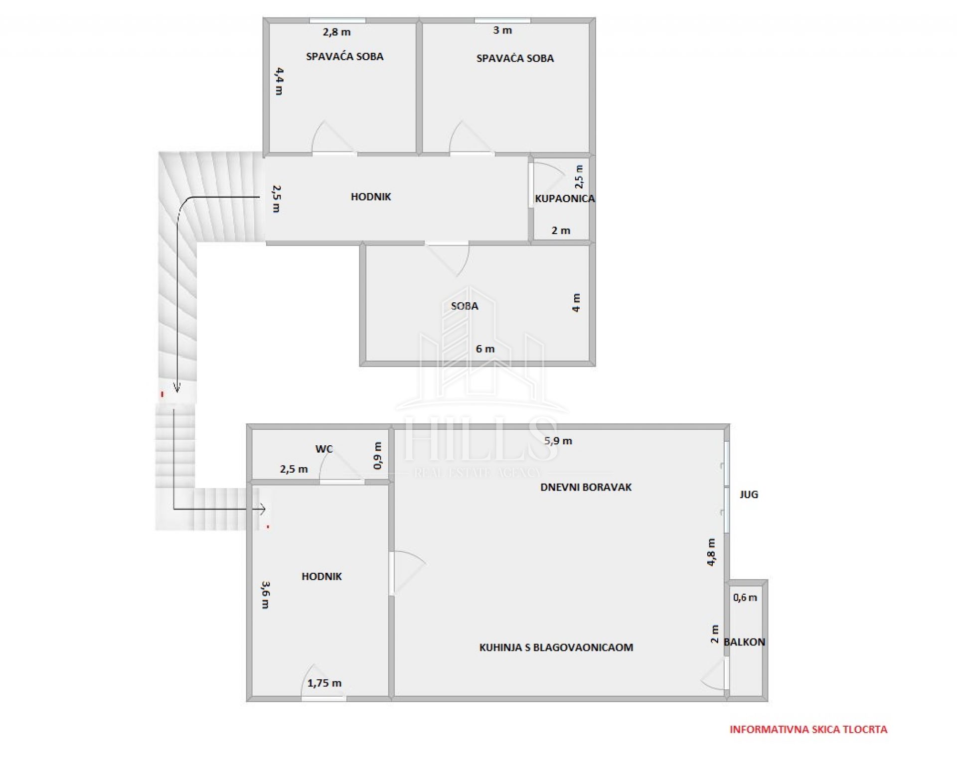 Stan se sastoji od dnevnog boravka, kuhinje s blagovaonicom, dvije spavaće sobe, kupaonice, WC-a, hodnika i balkona.