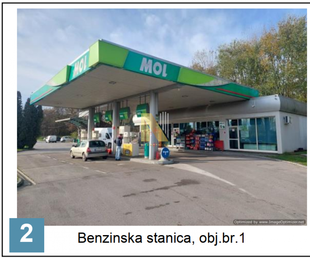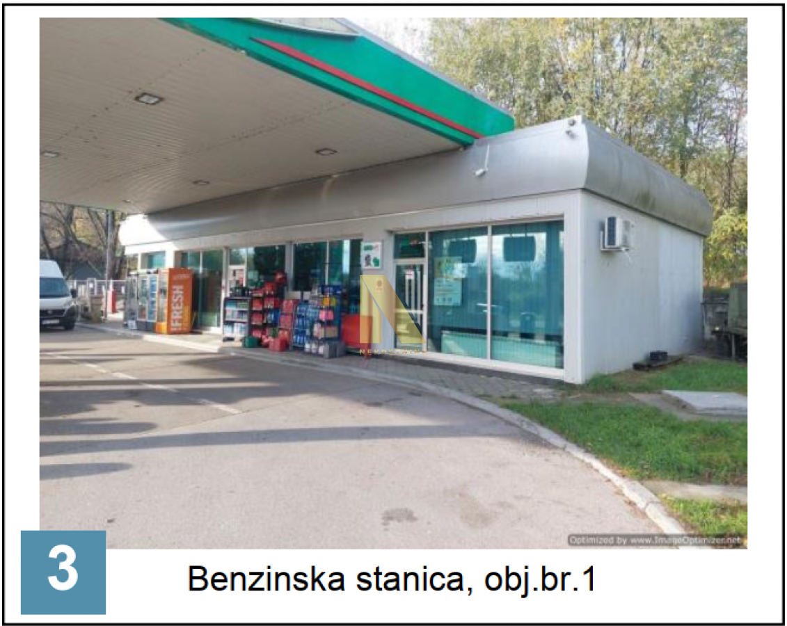 Opis: Predmetni kompleks benzinske stanice sastoji se od četiri uknjižena objekta i to: zgrade benzinske stanice, obj.br.1, gasne stanice, obj.br.3, pretakališta, obj.br.4, i pomoćne zgrade obj.br.5. Pomoćni objekat br. 5 neće biti predmet procene jer je izgrađen bez odobrenja za gradnju.