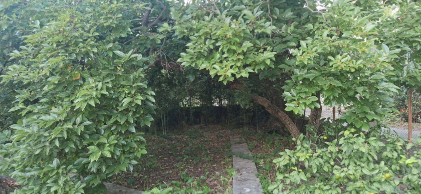 Large garden with persimmons, kiwis, grapes, apples, tangerines, and oranges.