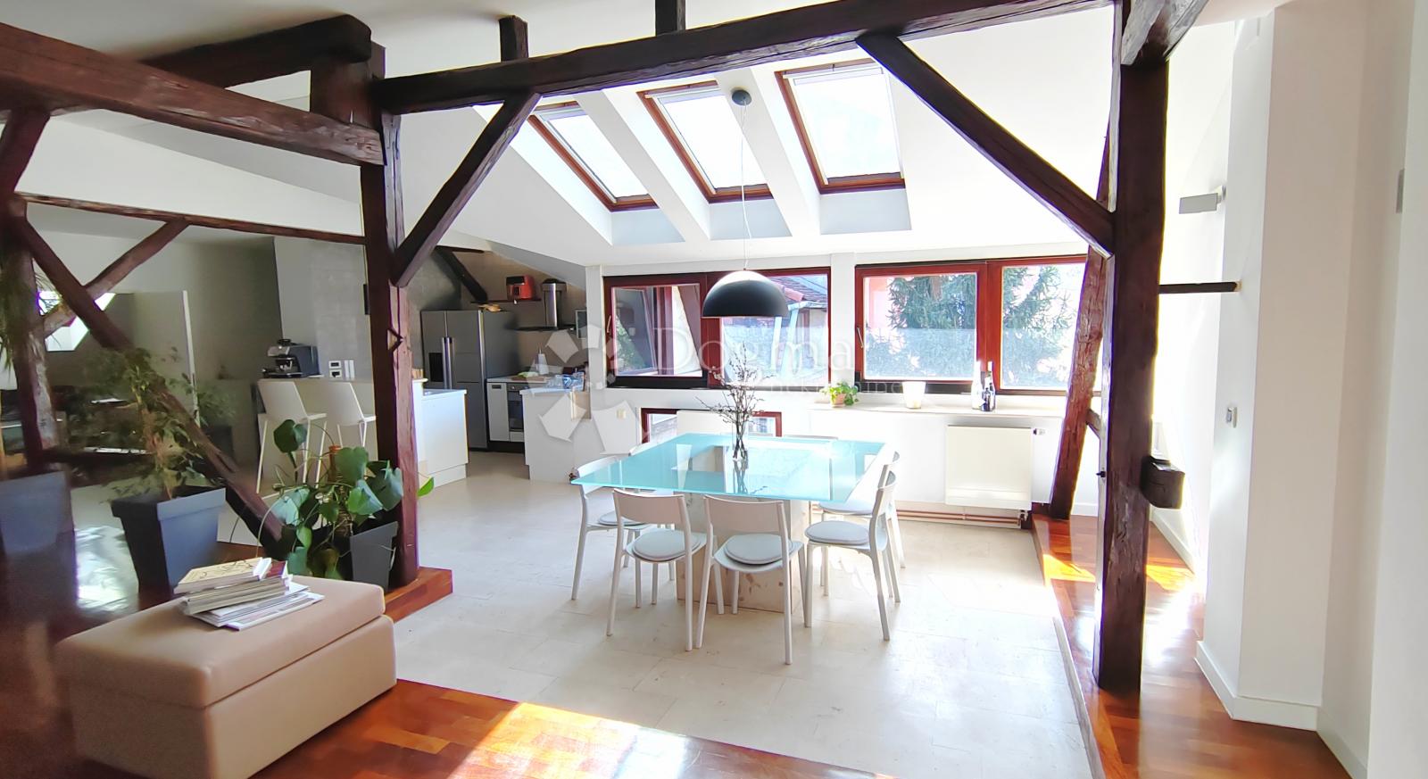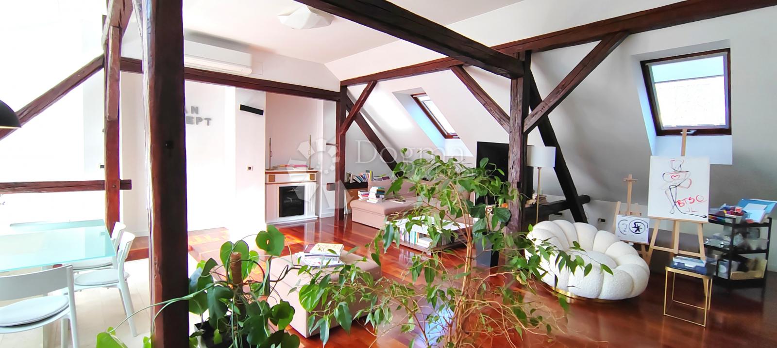 Opis: U srcu grada, samo nekoliko minuta hoda od Ilice i Trga Franje Tuđmana, smjestio se ovaj predivan, prostran stan u visokom potkrovlju zgrade od dva kata.