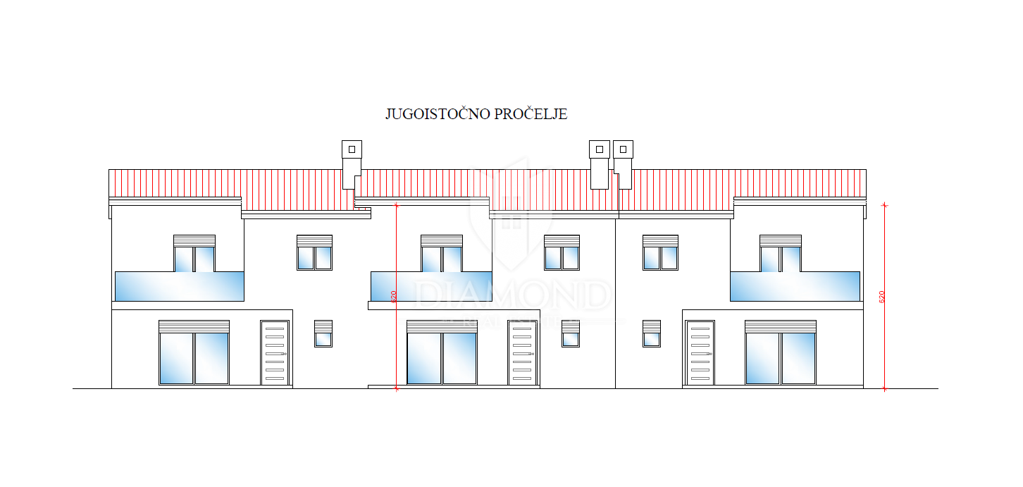 Ukupna površina kuće je netto 102m2 s okućnicom od 250 do 350m2 i vlastitim bazenom od 24m2. Kuća se proteže na dvije etaže te se sastoji od ulazne terase, hodnika, tehničkog prostora, spremišta, kupaonice, dnevnog boravka, kuhinje i blagovaonice s izlazom na vlastitu okućnicu i bazen. Na katu su smještene 3 spavaće sobe od kojih 2 imaju balkon, kupaonica i wc. S balkona će se pružati lijepi pogled prema moru i zelenilu Istre. Stolarija će biti PVC sa roletnama i komarnicima smeđe boje, dok će fasada biti bijele boje uz mediteran crijep čime će se kuća stopiti u prirodan ambijent. Radi se kući koja se nalazi u novom kompleksu od ukupno 24 kuća na 8 zemljišta. Na svakom zemljištu će biti 3 kuće razdvojene spremištem.