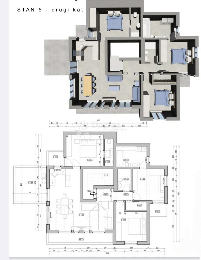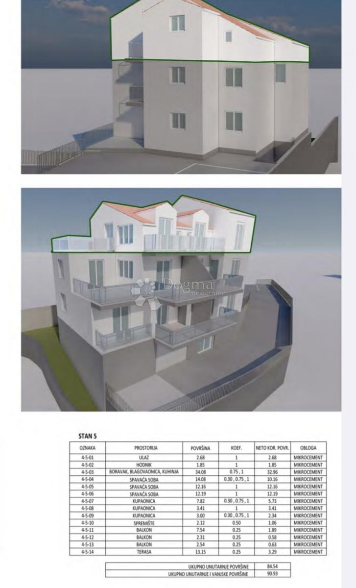 Opis: Prodaje se stan u novogradnji u Mlinima, predio Krstac, smješten na drugom katu potkrovlja moderne i kvalitetno izgrađene zgrade. Ovaj prostrani trosobni stan s terasom i tri balkona, ukupne površine 90,93 m2, zauzima cijelu gornju etažu stambene zgrade koja broji ukupno pet stanova raspoređenih na četiri etaže.