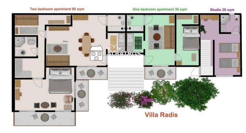 Opis: Izdaje se porodicna kuca są vise apartmana. Pogleda na more iz svih apartmana i posebni ulazi. Kuca se sastoji od :