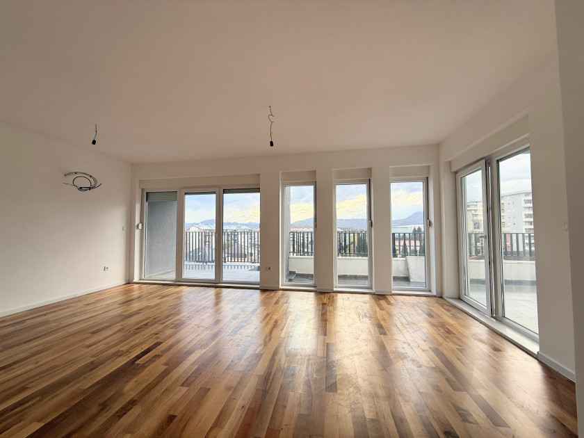Stan se sastoji od ulaznog hola, otvorenog dnevnog boravka sa odvojenom kuhinjom, tri spavaće sobe, dva kupatila i dvije terase od kojih je jedna velika trostrano orijetisana i sa koje se pruža pogled na grad.