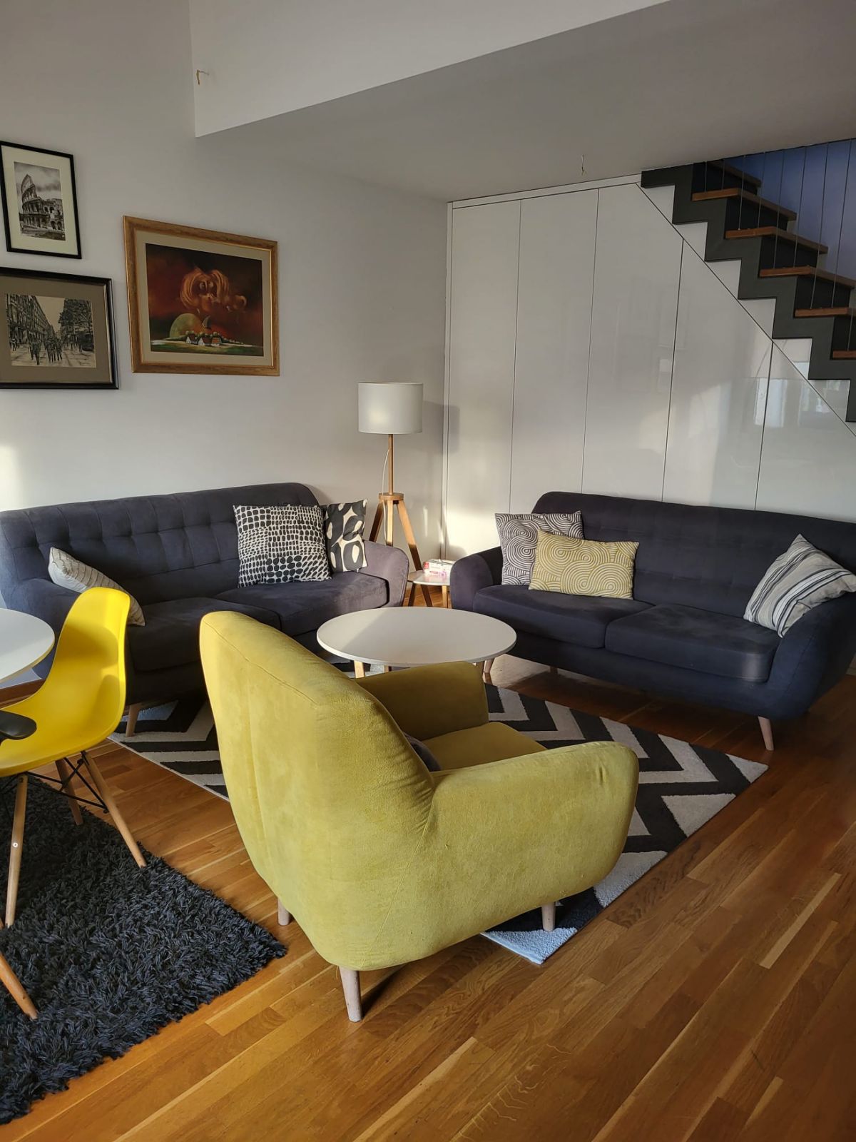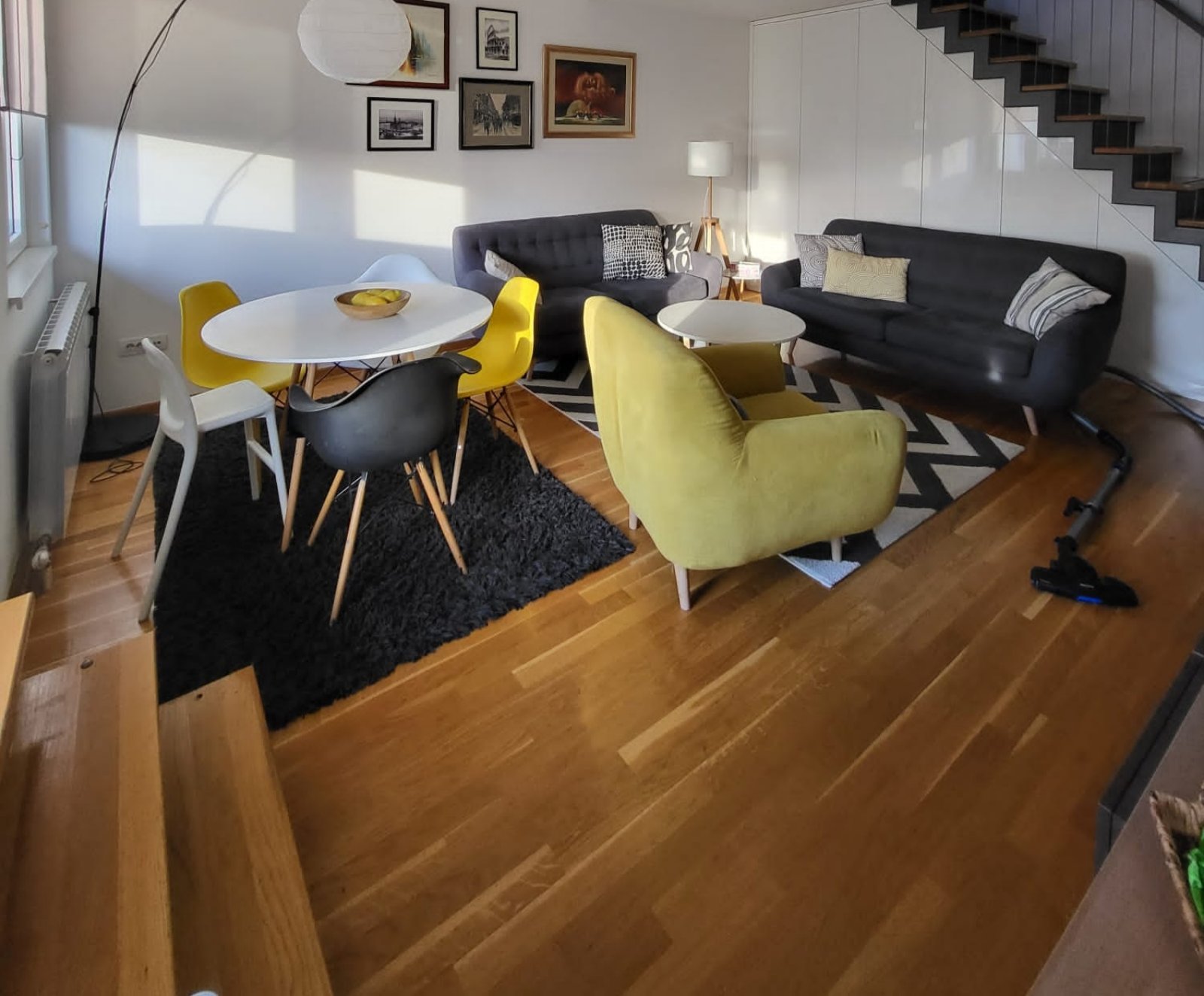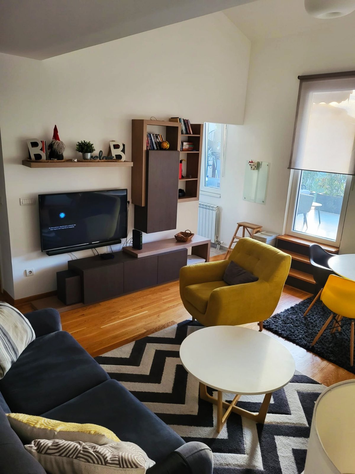 - Gornji nivo: dve decije sobe, radni deo za ucenje, novo kupatilo sa tus kabinom.