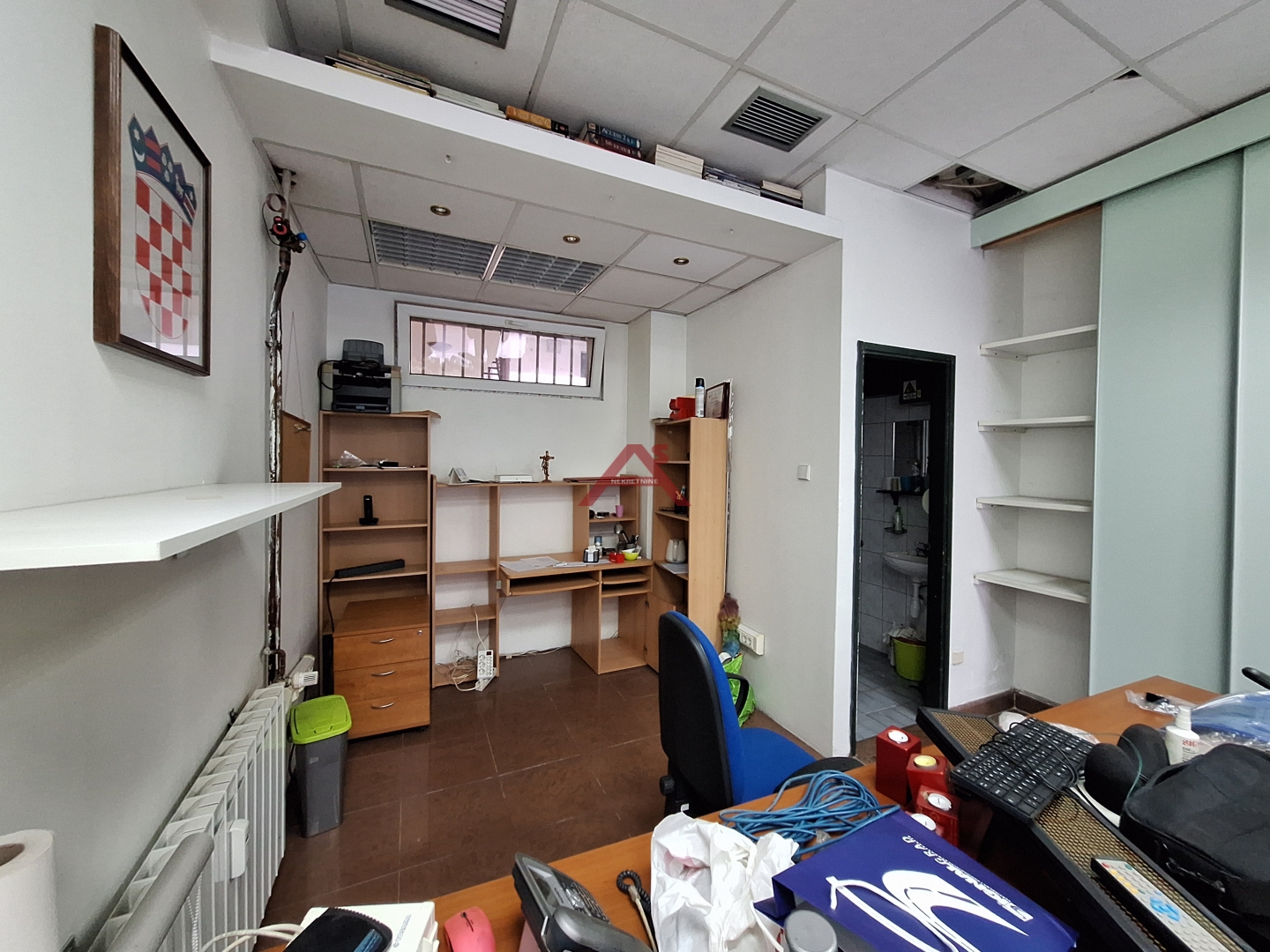 Prostor se do sada koristio kao ured pa uz njega dolazi i uredski namještaj ( veliki ugradbeni ormar i viseće police rađene po mjeri).