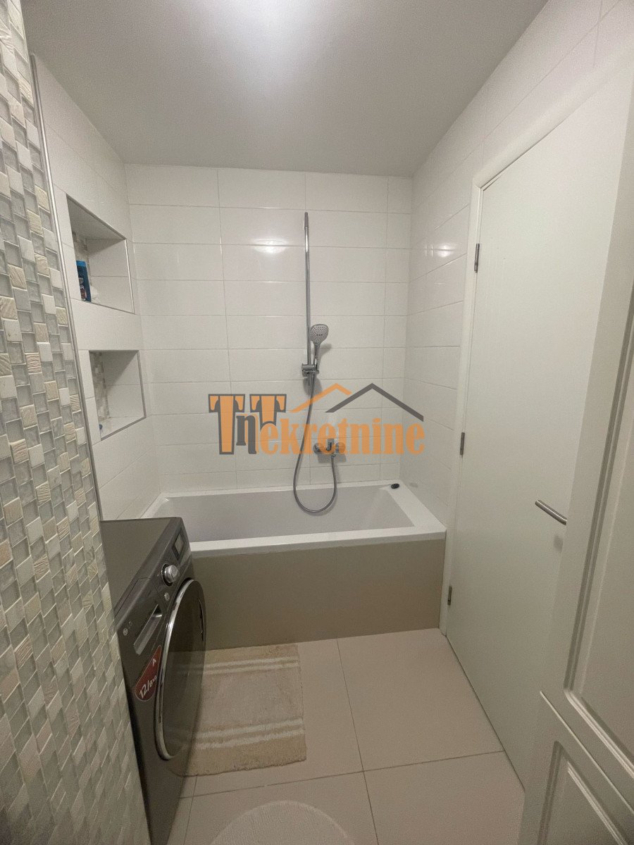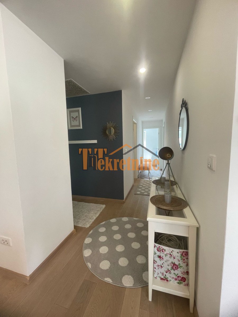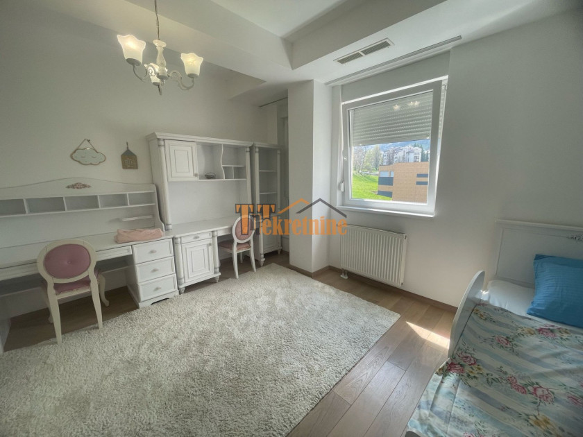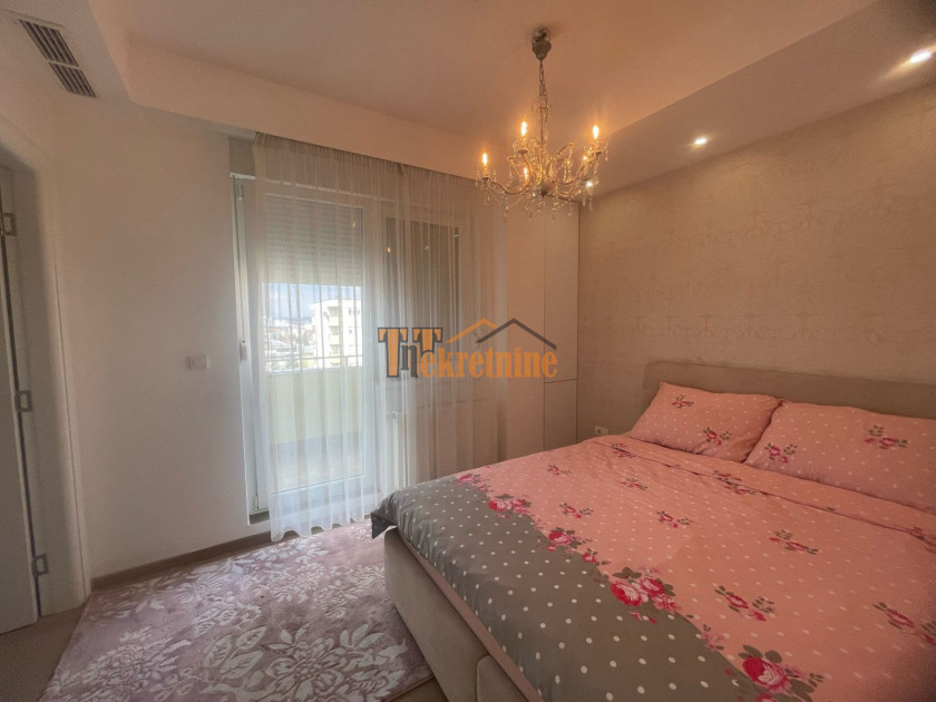 Stan je komplet namješten, opremljen je svim uređajima i kućanskim aparatima, takođe u cijenu mjesečnog najma ulazi i dva garažna mjesta.