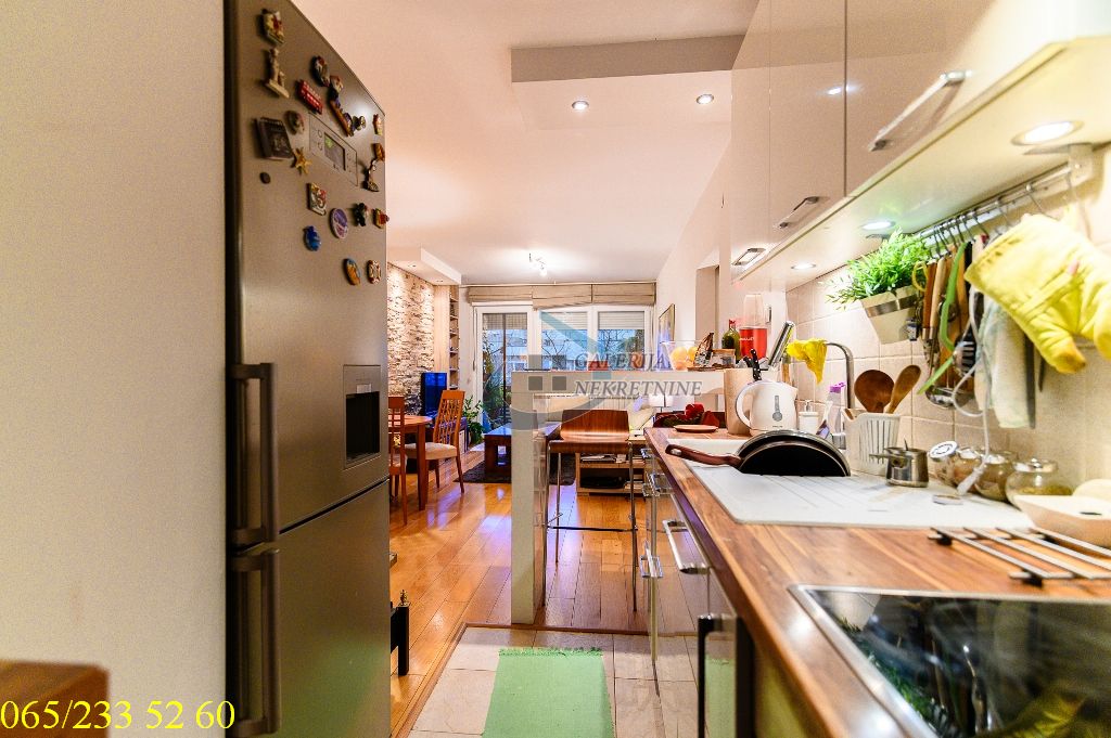 U prilici smo da vam ponudimo trosobni stan na poslednjem spratu petospratnice sa liftom iz 70ih godina prošlog veka. Zgrada je vrlo kvalitetno zidana i odlično održavana, pa je u odličnom stanju spolja i unutra. Stan je dvostrano orijentisan, većim delom prema jugu i izuzetno svetao. Prostorije su vrlo funkcionalno raspoređene. Dnevni boravak, u modernom open space stilu, deli prstor sa trpezarijskim delom i kuhinjom, koja je blago izdvojena pultom. Lepa terasa, sa pogledom na zelenilo je kao stvorena za uživanje. Stan je pre desetak godina vrlo kvalitetno i luksuzno dizajniran i renoviran do najsitnijih detalja, pa nisu potrebna značajna ulaganja. U stanu ostaje cela kuhinja sa svim elemetnima i opremom. Grejanje je centralno. Uz stan ide mogućnost korišćenjaće ostave na spratu.